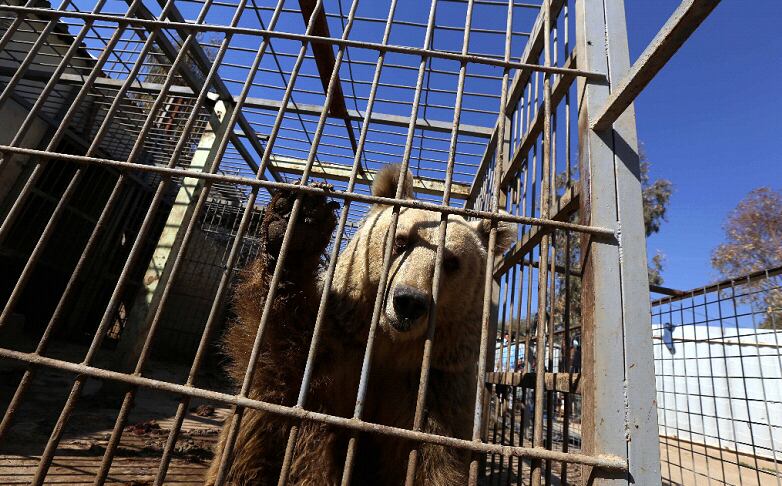 Simba el león y Lula la osa dan vueltas en la jaula con el pelaje cubierto de lodo y excrementos. Son los únicos animales que quedan en un zoológico de Mosul devastado por los combates.