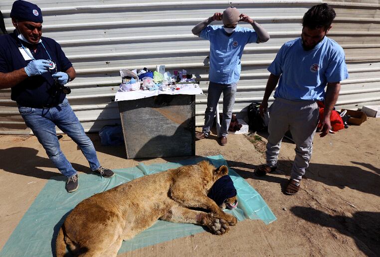 Para protegerse, el veterinario Amir Jalil se tapa la nariz con una mascarilla quirúrgica, y después llena las jeringas. Con la ayuda de una cerbatana lanza la anestesia contra un costado del león, que embiste los barrotes de la jaula con un rugido impresionante.