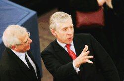 El canciller inglés, Jack Straw (der.), bromeó ayer con el presidente del Parlamento Europeo, Josep Borrell, poco antes de la votación. | AFP (GERARD CERLES)
