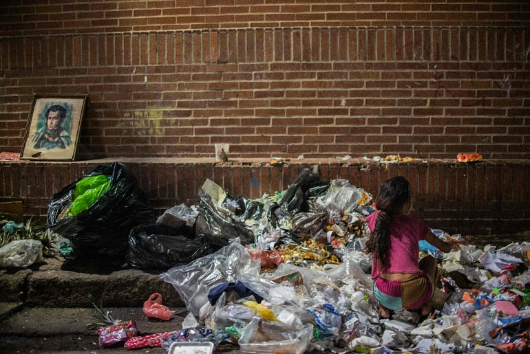 El camión de la basura frena y Rebeca corre hacia el contenedor para hurgar las bolsas. Es su carrera diaria contra el hambre, que tiene a muchos venezolanos viviendo de sobras.