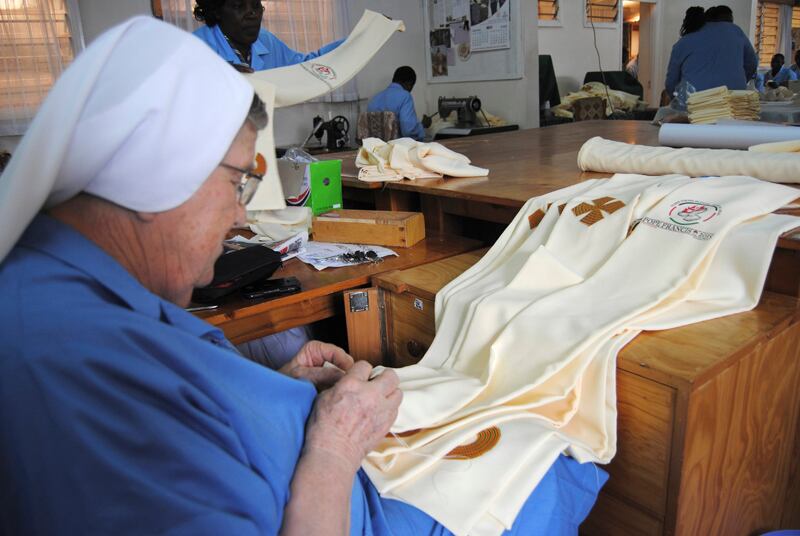 La hermana Ida Lagonegro, de 73 años, terminaba el martes una de las 2.000 estolas que se han preparado con la inscripción “Pope Francis 2015” y con una cruz bordada con tela africana que llevarán todos los sacerdotes que participen en la visita papal al continente africano. | EFE (Jèssica Martorell)