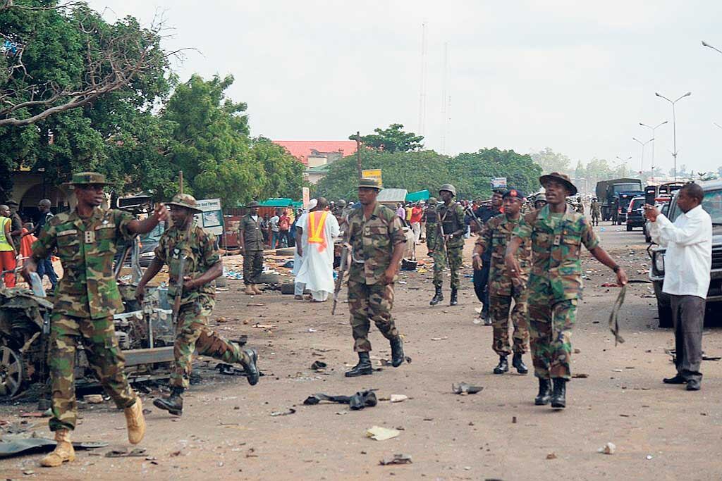 Los oficiales militares resguardan una escena donde una bomba estalló en Kaduna, al norte de Nigeria. (AFP)