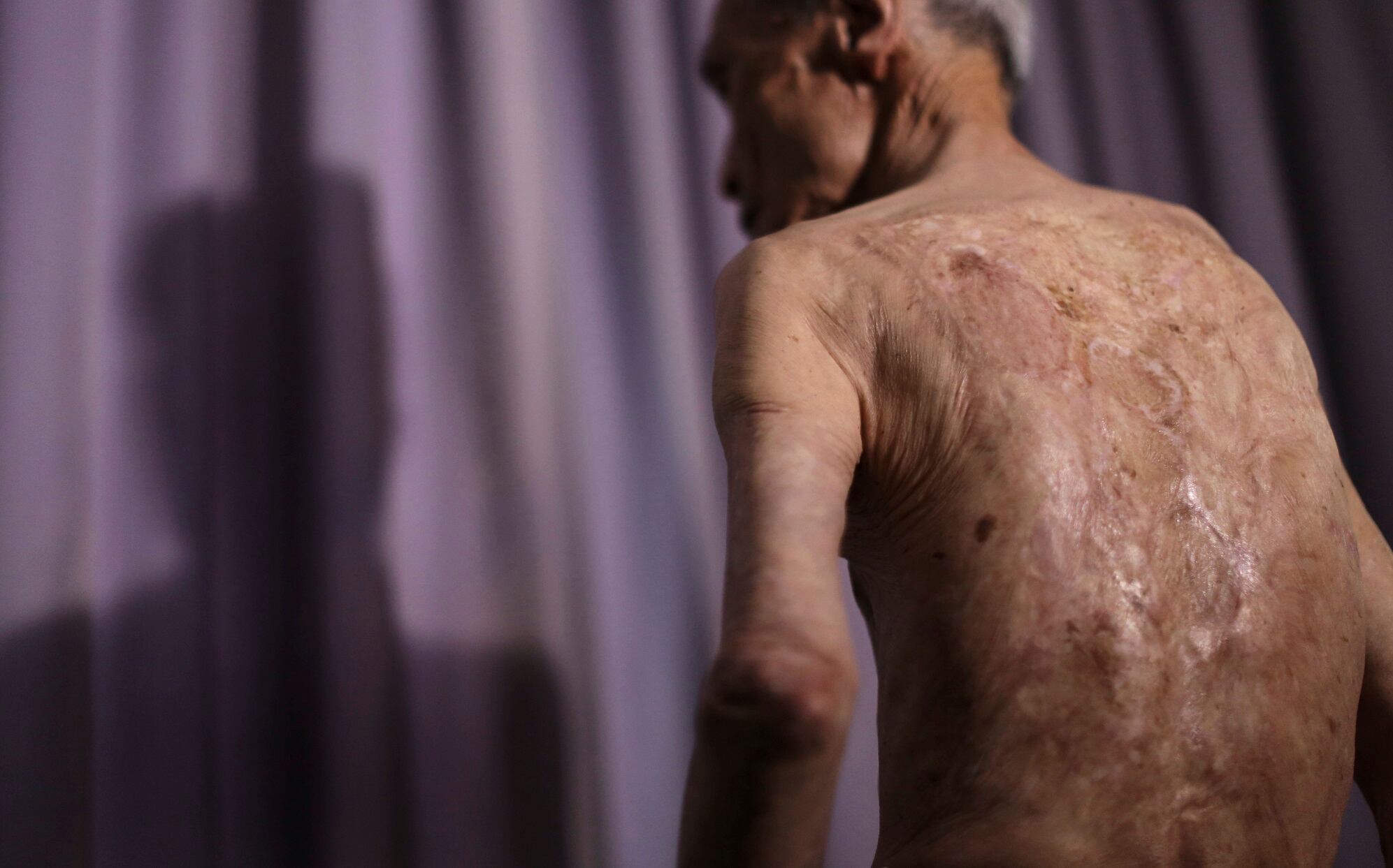 Sumiteru Taniguchi, superviviente del bombardeo atómico de Nagasaki en 1945, mostraba una foto de él con las graves lesiones que sufrió en aquel momento. Taniguchi murió este miércoles 30 de agosto del 2017. (AP)