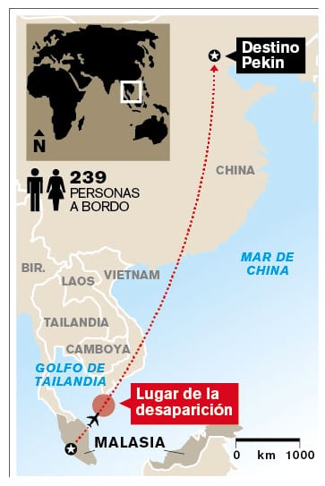 El vuelo MH370, que transportaba 227 pasajeros de varias nacionalidades diferentes y 12 tripulantes, salió de los radares entre las costas de Malasia y las de Vietnam sin haber enviado ningún mensaje de auxilio.