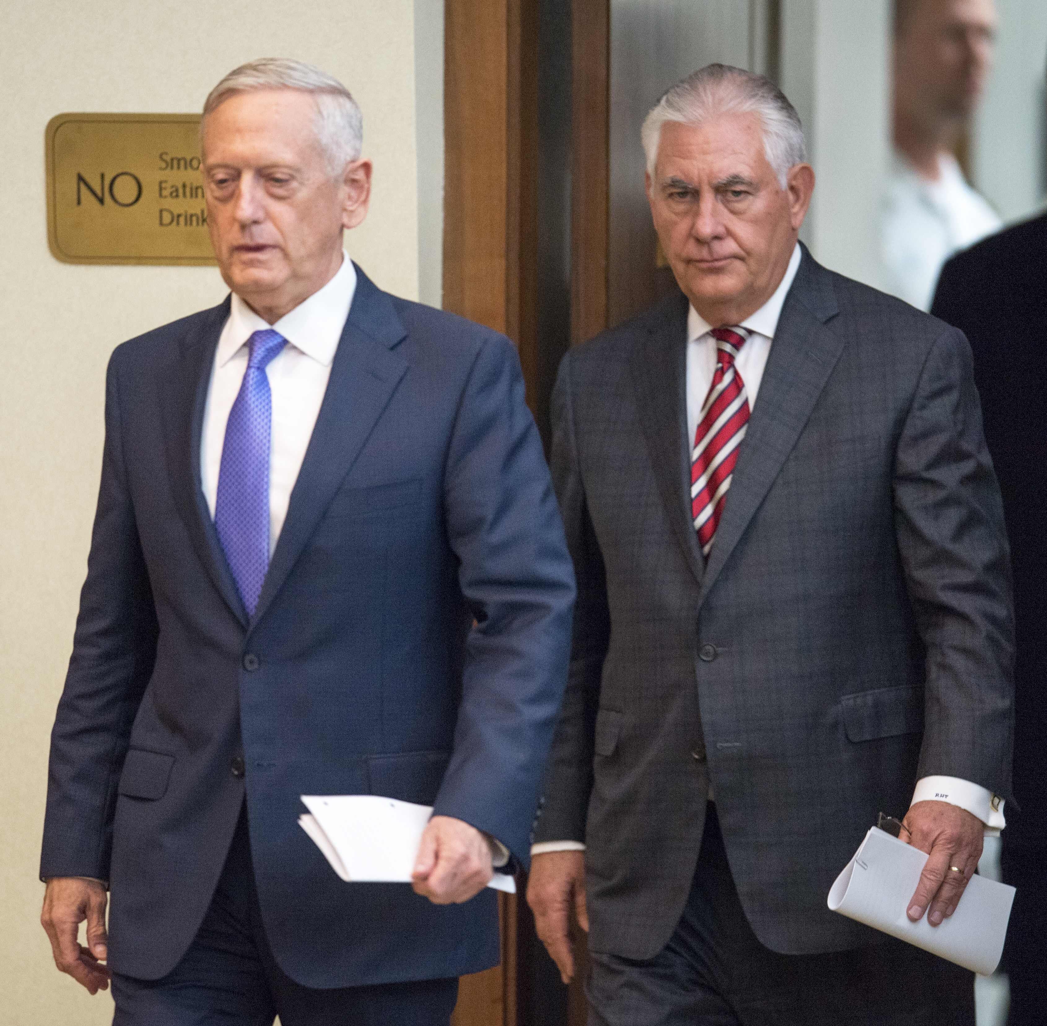El Secretario de Defensa de Estados Unidos, Jim Mattis (izq.), y el Secretario de Estado, Rex Tillerson, se dirigen hacia una conferencia de prensa tras la reunión con una delegación china, este miércoles 21 de junio en Washington. (AFP)