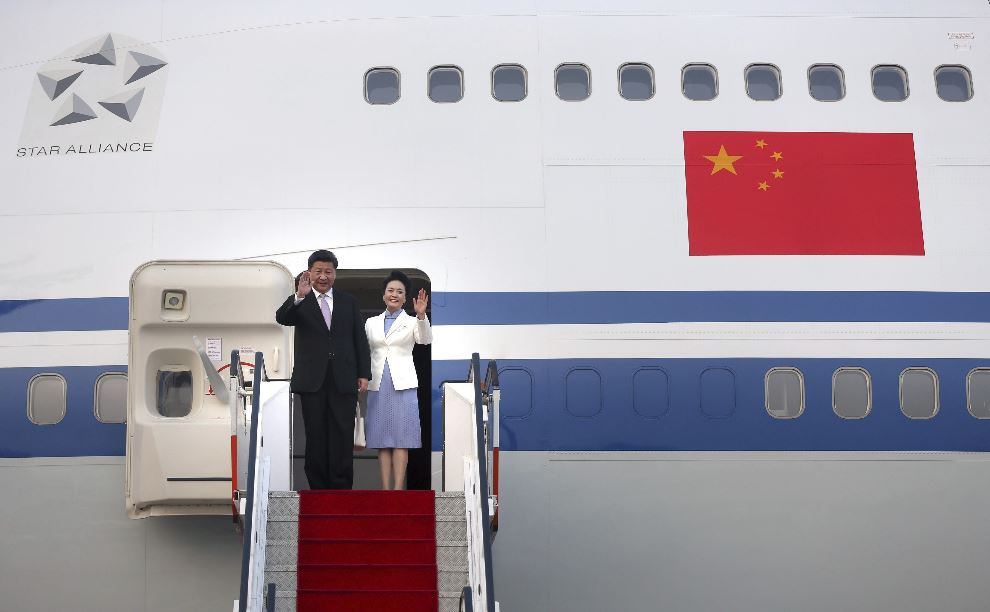 El presidente chino, Xi Jinping, y su esposa, Peng Liyuan, saludan a su llegada al aeropuerto de Changi en Singapur, este viernes.