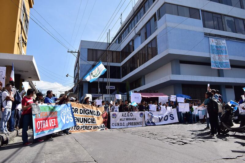 Un grupo de universitarios exigían el martes la renuncia de Pérez Molina y la suspensión de las elecciones generales, en una manifestación frente a la sede de la Superintendencia de Administración Tributaria (SAT), en la ciudad de Quetzaltenango. | EFE (Esteban Biba)