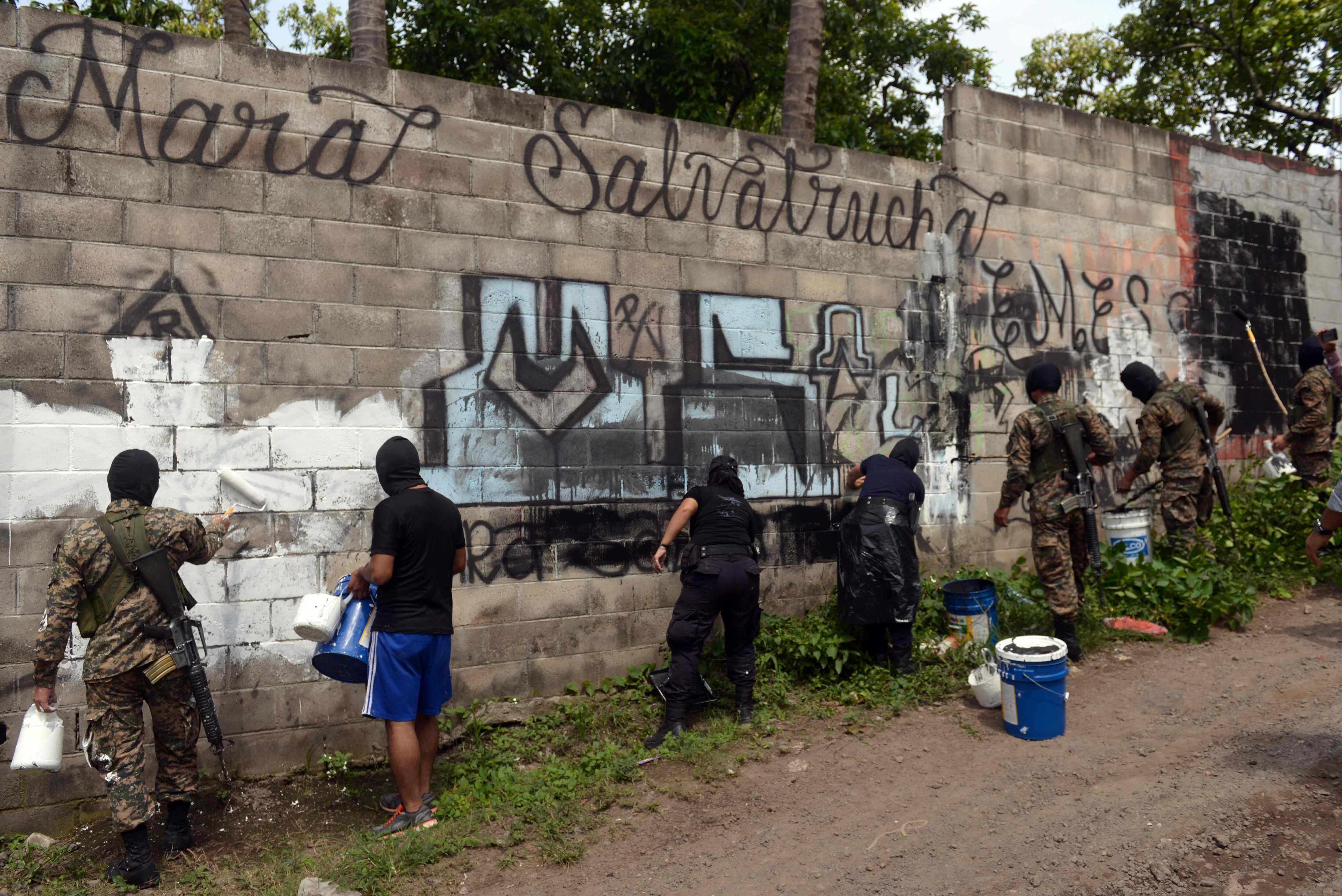 Policías y militares de El Salvador borraron este martes los grafitis estampados por las pandillas en la ciudad de Quezaltepeque, 25 km al norte de San Salvador, en el marco de una ofensiva que busca recuperar zonas dominadas por esas bandas, constató un periodista de la AFP.