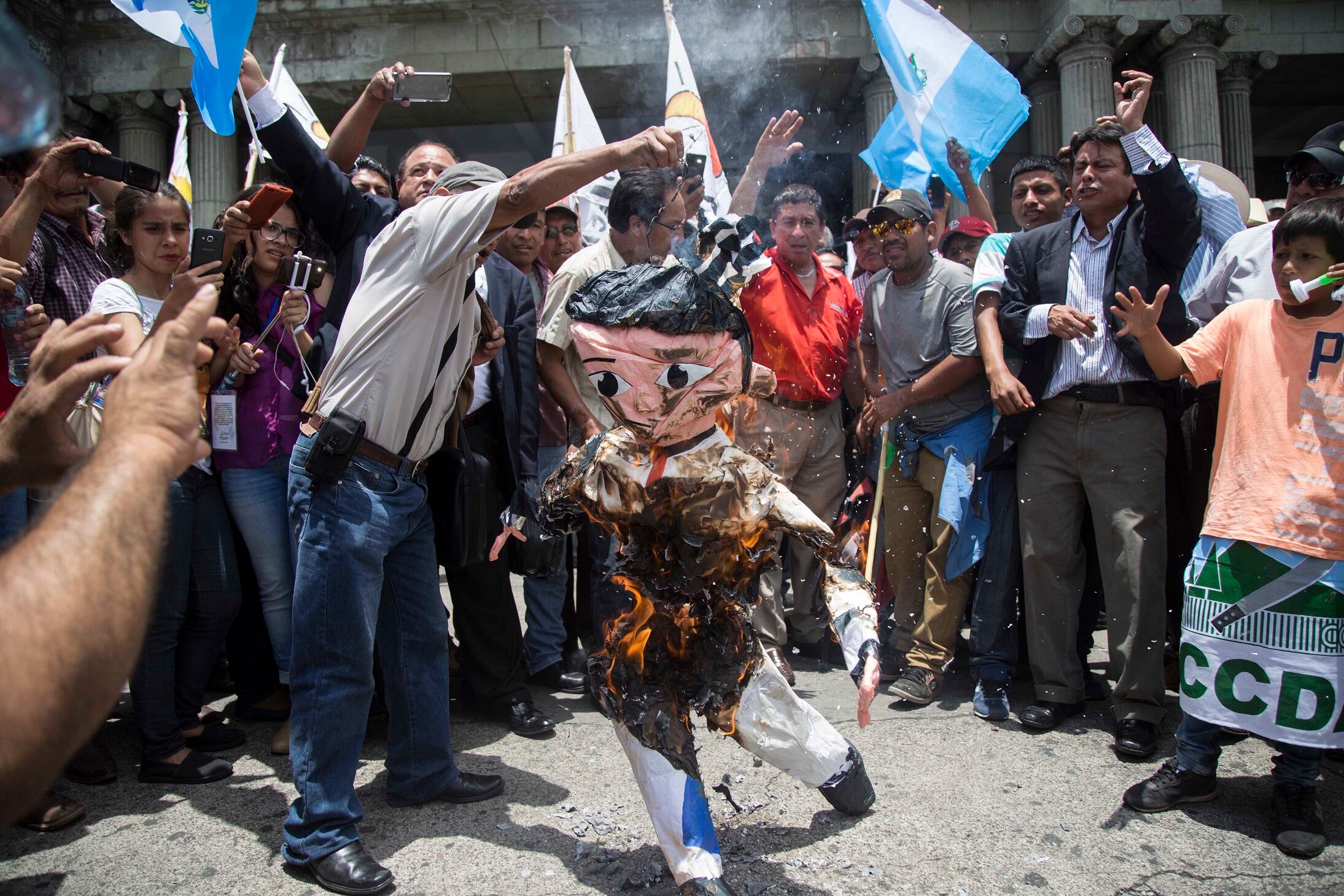 Decenas de indígenas, campesinos y estudiantes salieron a las calles del centro histórico capitalino para demandar la dimisión del mandatario, conocido por la mayoría de los guatemaltecos por su pasado como comediante y quien ganó las elecciones dos años atrás con la promesa de sepultar a la corrupción rampante en el país.