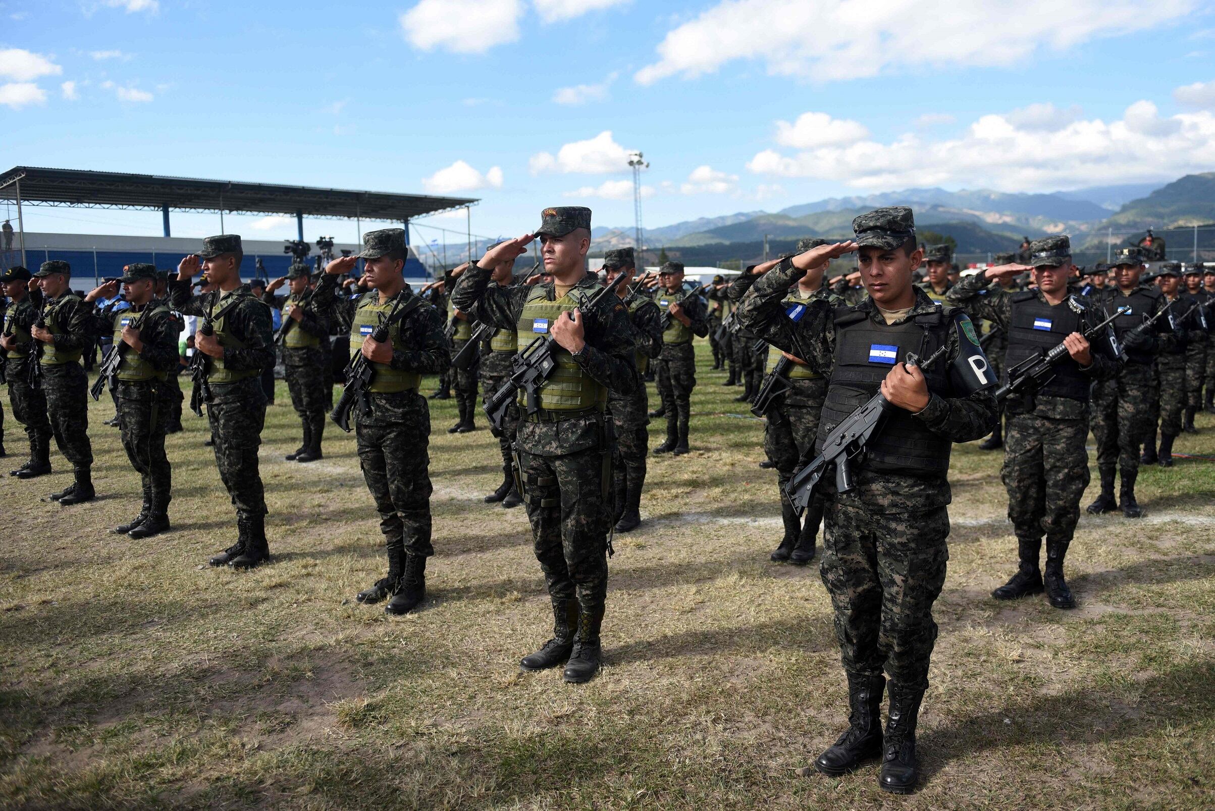 Un grupo de soldados participó el martes en el lanzamiento oficial de la Fuerza Trinacional, por medio de la cual Honduras, Guatemala y El Salvador pretenden combatir el crimen organizado en esos países del Triángulo Norte. La ceremonia se llegó a cabo en Nueva Ocotepeque, Honduras. (AFP)