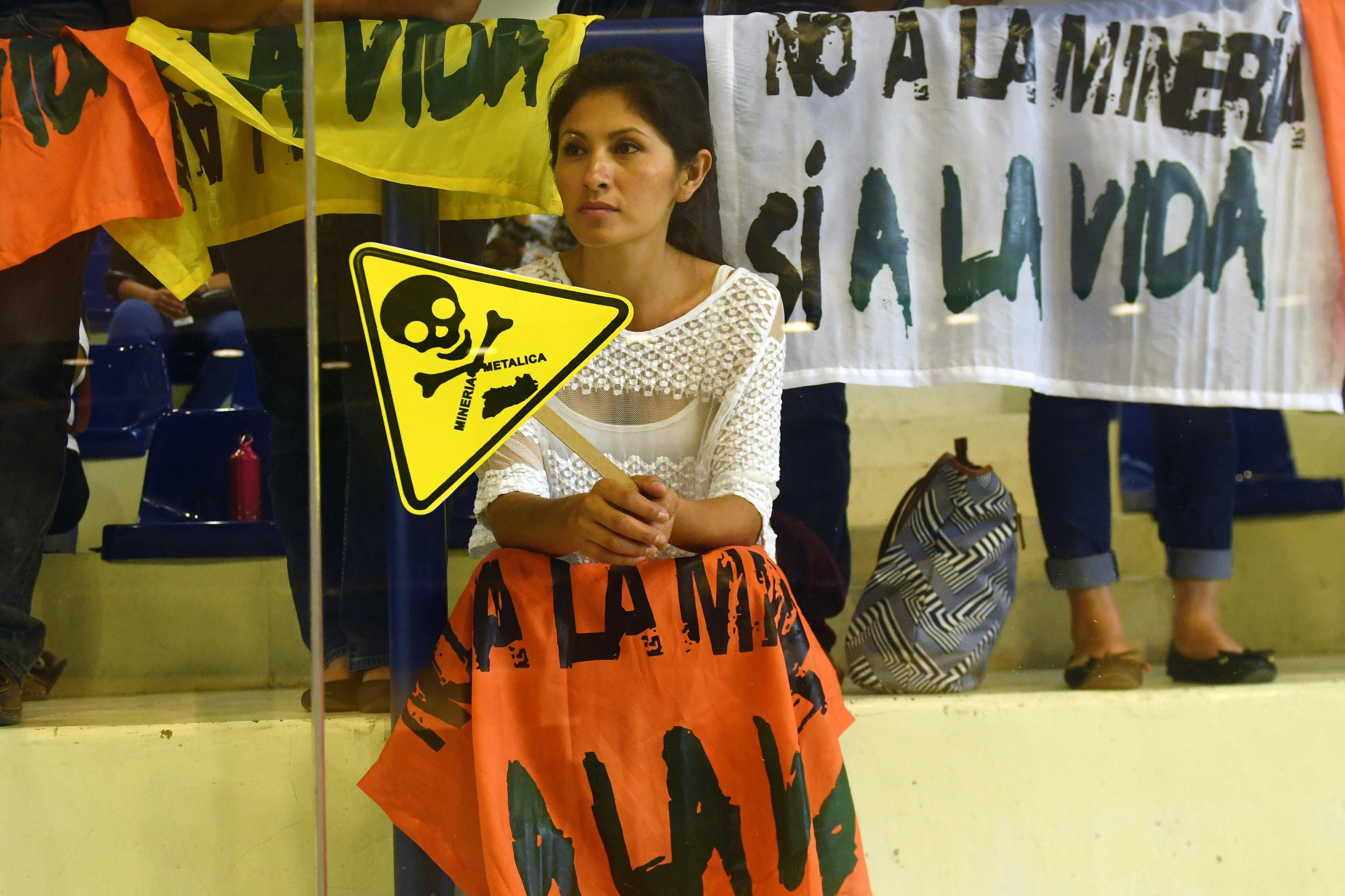 Una joven salvadoreña protestó este miércoles contra la minería en la Asamblea Legislativa en San Salvador. (AFP)