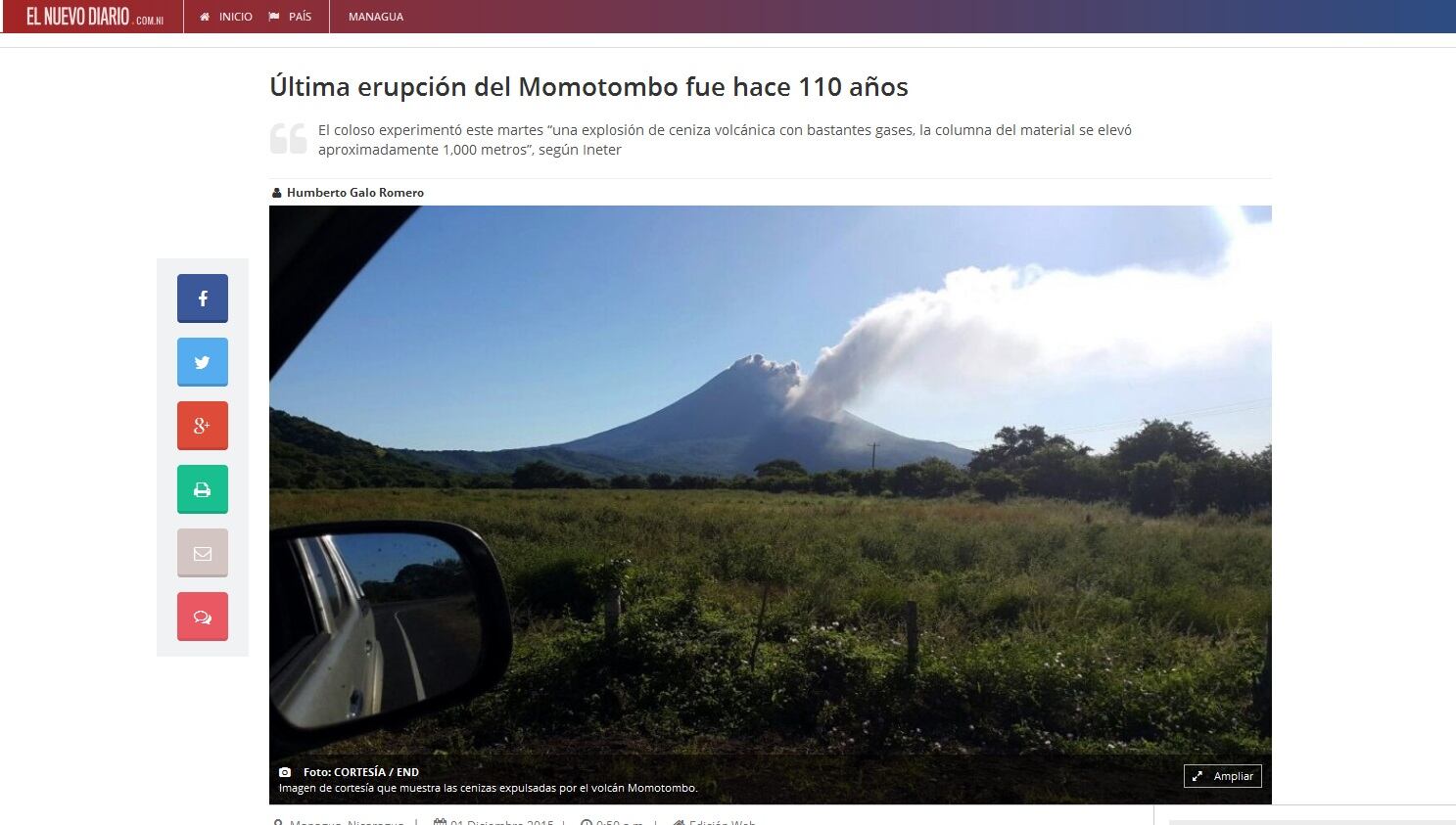 Volcán Momotombo de Nicaragua expulsa gas y cenizas