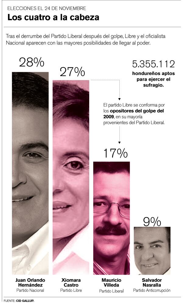 Las encuestas dicen que Xiomara Castro y Juan Orlando Hernández, del Partido Nacional, se disputarán la presidencia. Atrás vienen Mauricio Villeda, del Liberal, –antigua casa de Zelaya severamente golpeada tras el socollón del golpe– y Salvador Nasralla, una popular estrella de la televisión.