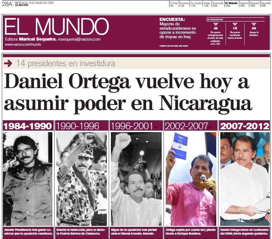 --Sandinismo: Daniel Ortega regresa al poder en el 2007, por la vía electoral y ahora opta por su segunda reelección consecutiva (la primera fue en el 2012). Con el triunfo de la Revolución sandinista, fungió como coordinador de la Junta de Reconstrucción Nacional hasta 1984 y, luego, como presidente hasta 1990. Durante esos 11 años, su hermano Humberto Ortega se desempeño como ministro de Defensa. Su esposa, Rosario Murillo, es la vocera del gobierno desde el 2007 y centraliza toda la política de comunicación del gobierno. Para los comicios de noviembre próximo, acompaña a Ortega como candidata a la vicepresidencia.