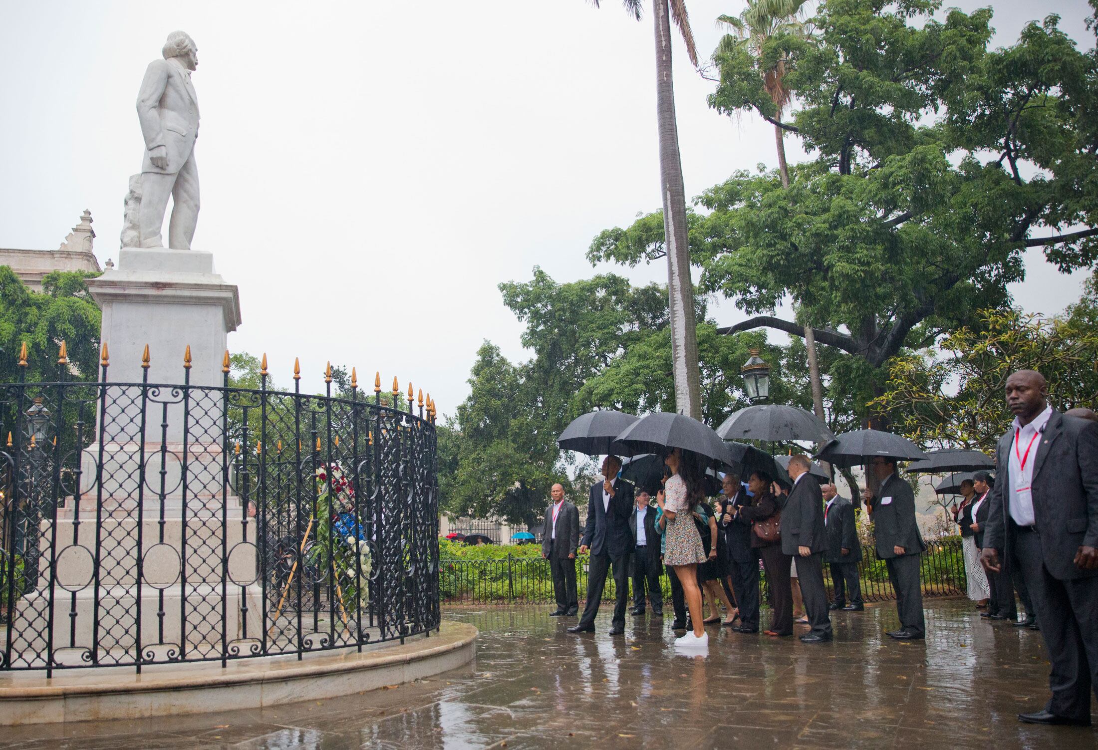 Protegida con paraguas, la comitiva caminó por la plaza de Armas, donde fue recibida con vítores a favor de Estados Unidos, acompañado de Eusebio Leal, historiador de la ciudad, quien les explicaba lo que observaban.