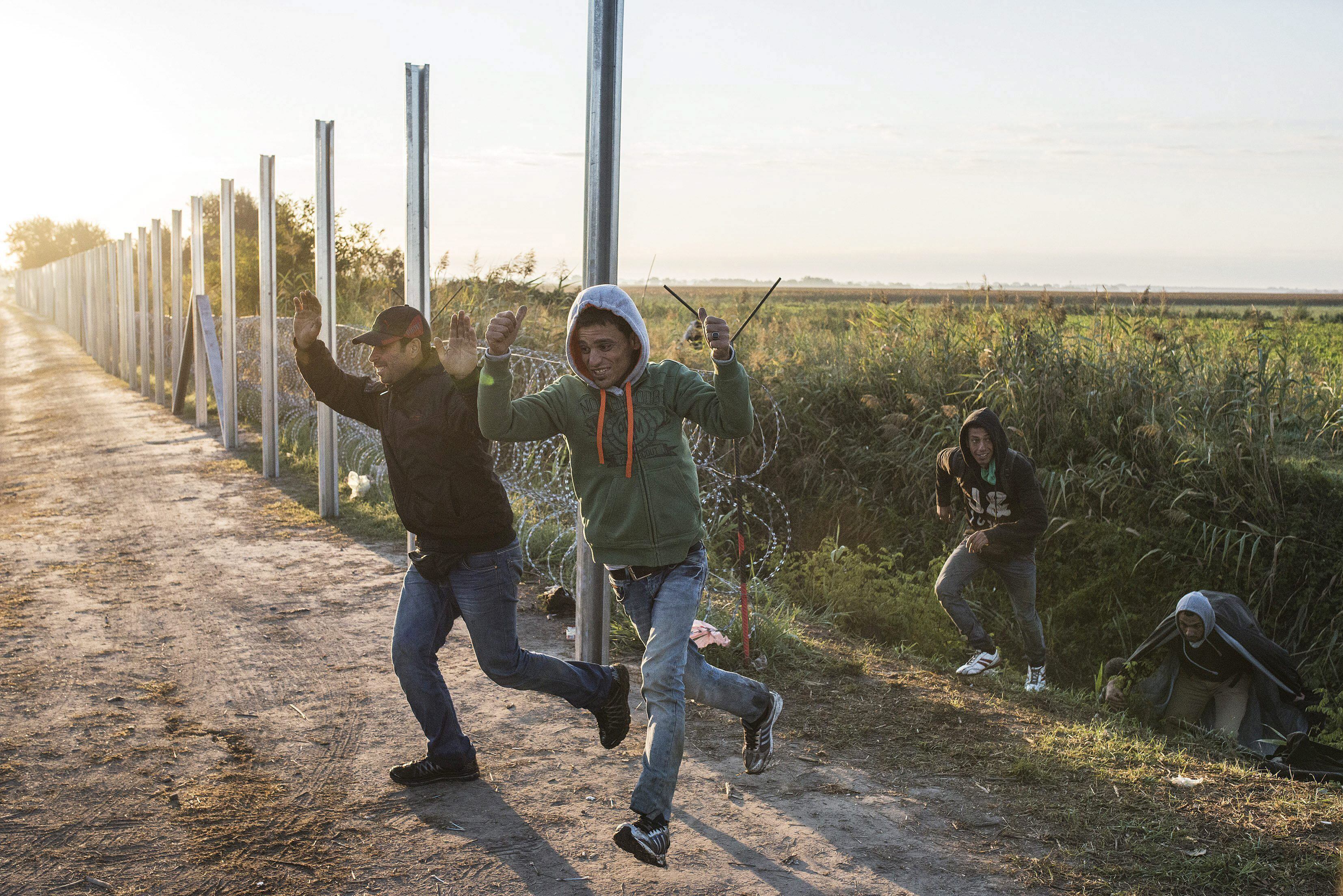 igrantes procedentes celebran pisar suelo húngaro tras atravesar la valla fronteriza procedentes de Serbia, en Roszke, población situada a unos 180 km al sureste de Budapest (Hungría), hoy, 9 de septiembre de 2015. (EFE/Sandor Ujvari )