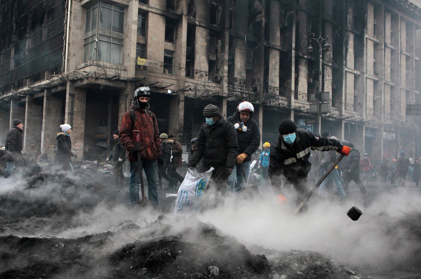 Manifestantes refuerzan las barricadas en la Plaza de Independencia en Kiev. (AP.)