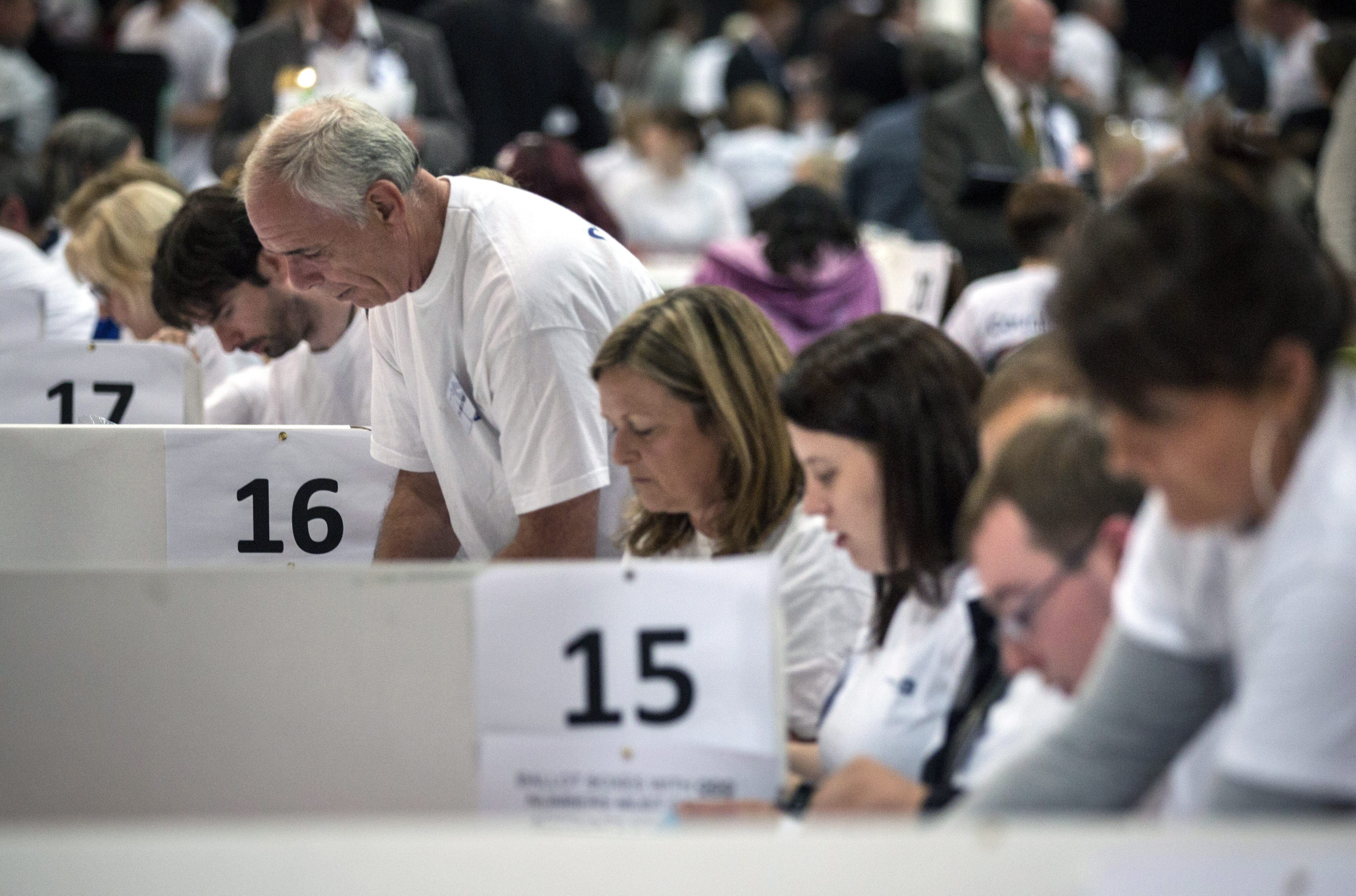 Autoridades realizan el conteo de votos del referéndum en Aberdeen, Escocia. (EFE)