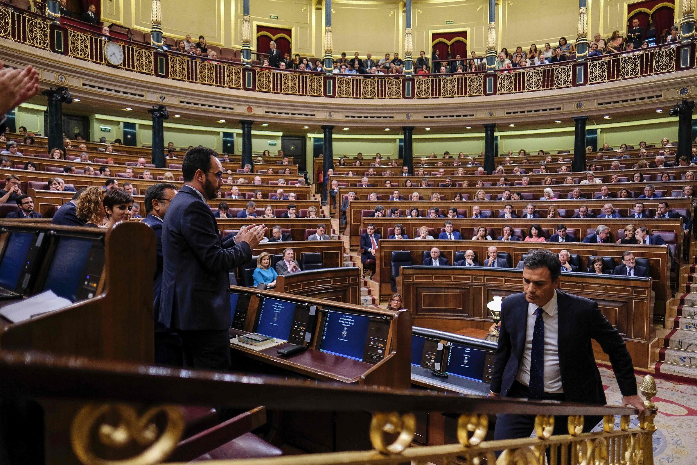 "Ha defraudado la confianza de los españoles", le espetó Sánchez a Rajoy, acusándolo de haber instaurado durante el gobierno del PP "una política en la que se utilizó la crisis para desmantelar el Estado de bienestar" en España.