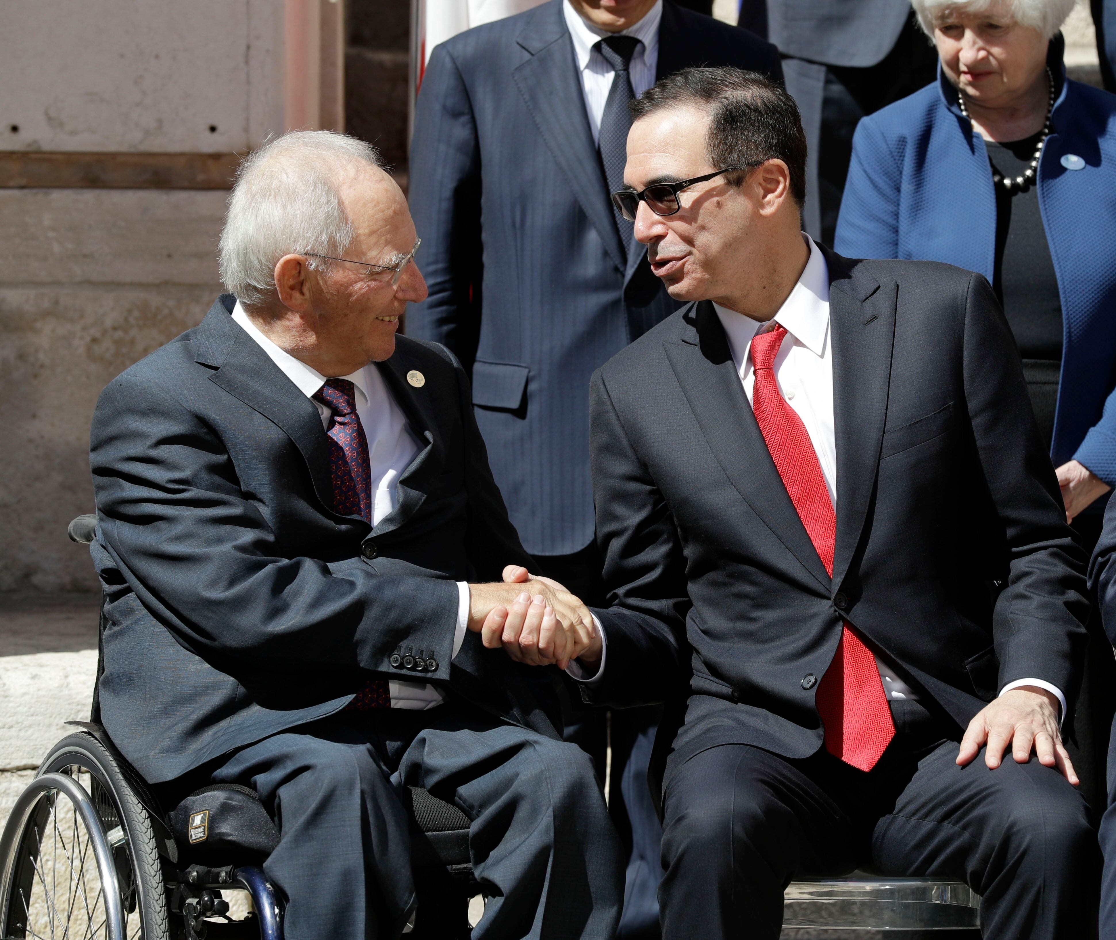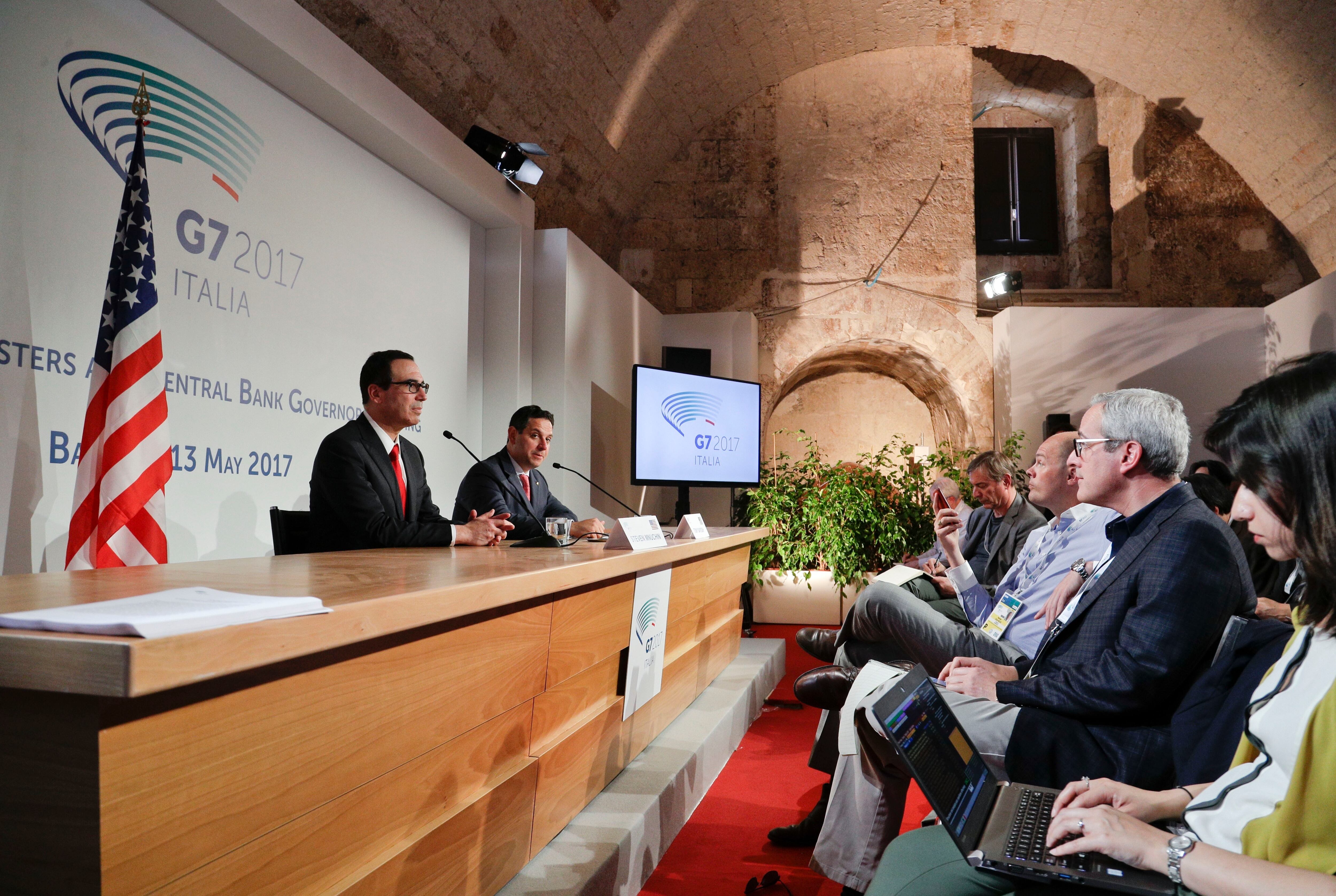 El secretario del Tesoro de Estados Unidos, Steven Mnuchin, a la izquierda, da una conferencia de prensa sobre el último día de una cumbre de tres días del G7 de ministros de finanzas. (AP)