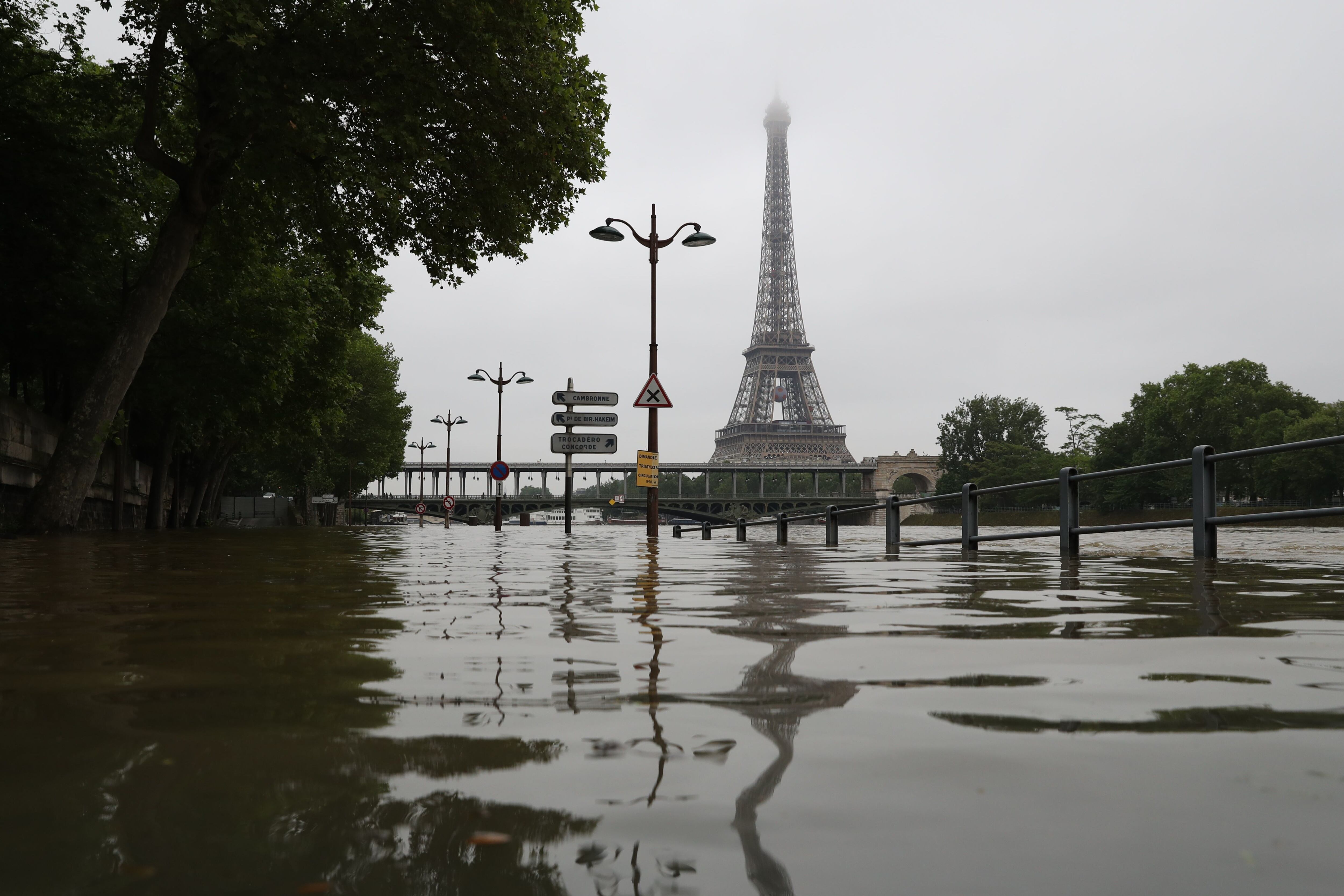 En París, las vías para automóviles a orillas del Sena, completamente bajo el agua, estaban cerradas. Los pies de la estatua del "Zouave" del Puente de Alma, que sirve de referencia a los parisinos desde hace más de un siglo para calcular el aumento del caudal del agua del río que atraviesa la capital, estaban bajo el agua.