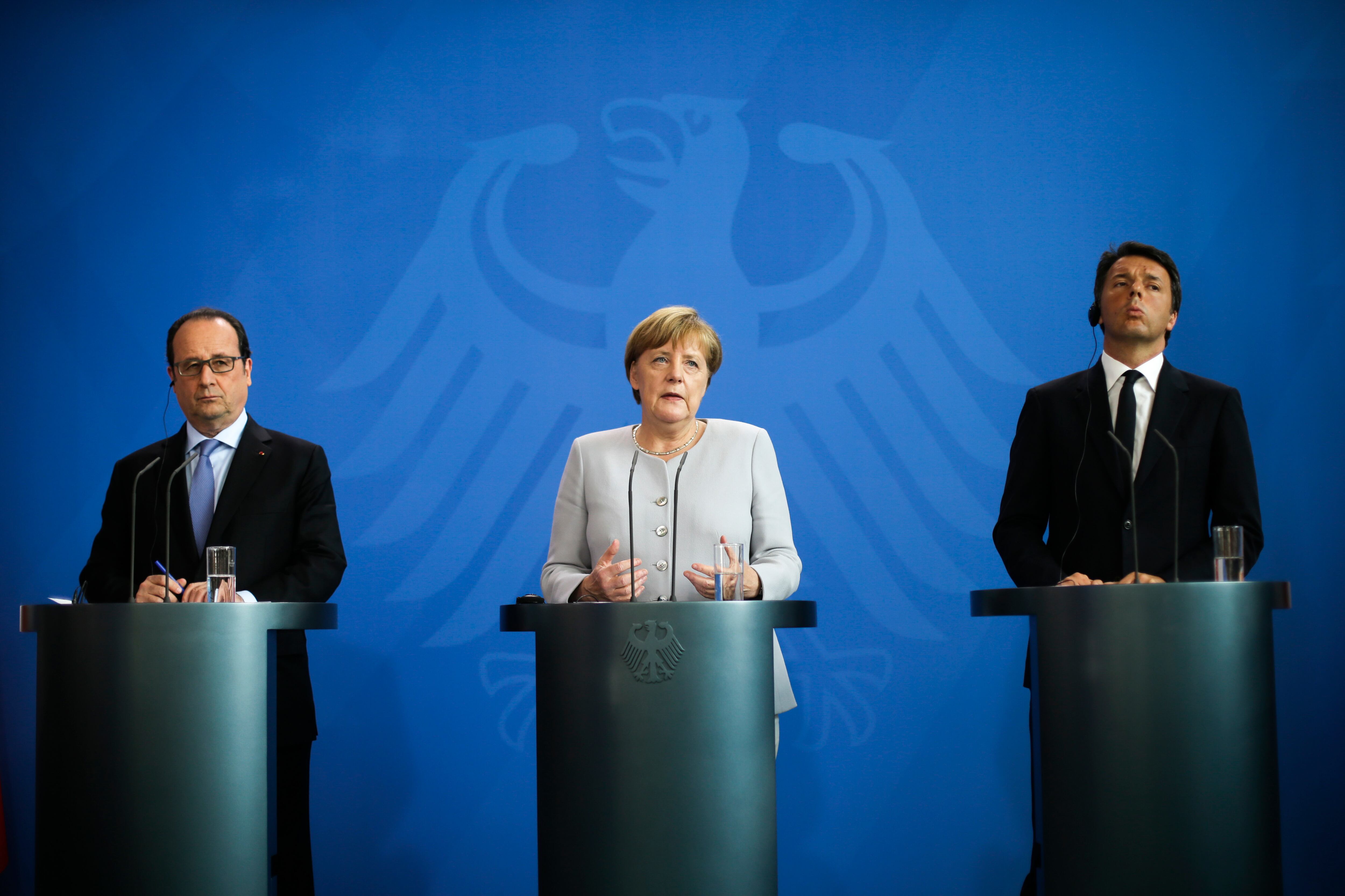 Francois Hollande, Angela Merkel y Matteo Renzi juntos, en una reunión celebrada el 27 de junio anterior en Berlín. (AP)
