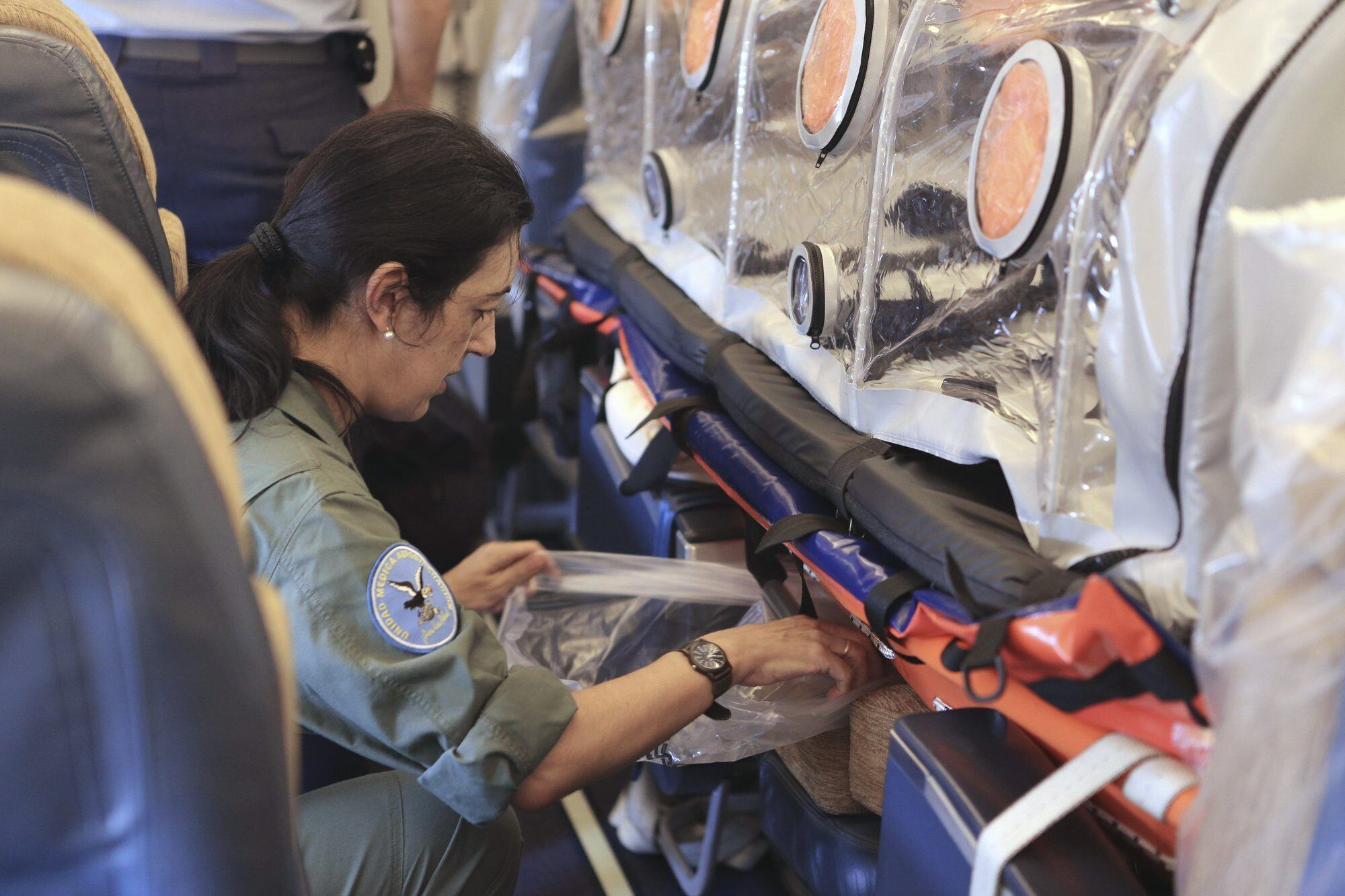 En la imagen se muestra el interior del Airbus A310 del 45 Grupo de Ejército del Aire encargado de trasladar al religioso español Miguel Pajares, infectado por el virus del ébola a Madrid. (EFE.)