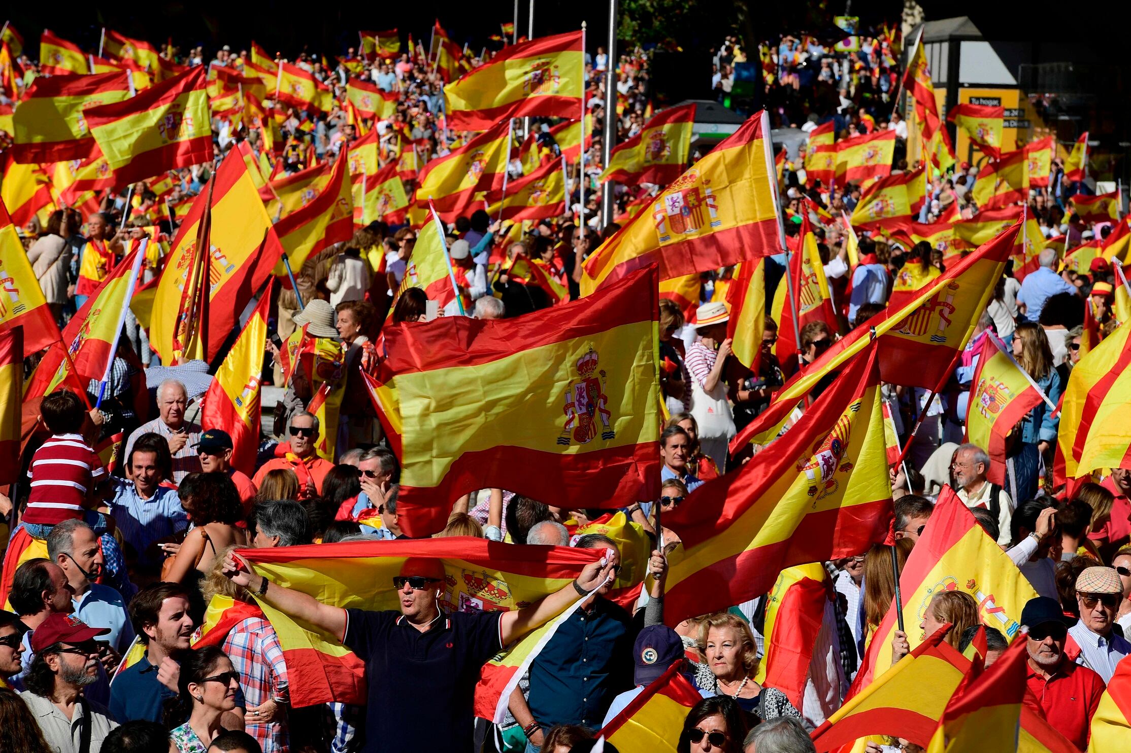 En la enorme plaza Colón de Madrid, presidida en su centro por una bandera española de 50 metros, una multitud con banderas españolas, en mástiles o anudadas como pañuelo, coreó lemas como "Cataluña es España, no nos engañan", "Puigdemont, a prisión" -en alusión a Carles Puigdemont, el presidente catalán- y "Con golpistas, no se dialoga".