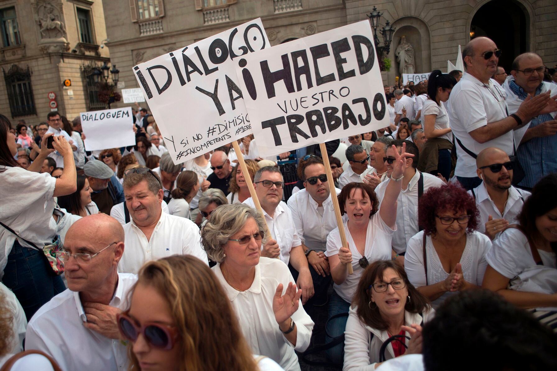 En la plaza Sant Jaume de Barcelona, flanqueada por el Ayuntamiento y el palacio de la Generalitat -el gobierno catalán-, también se reunieron, convocadas por Hablemos, cientos de personas en defensa de una solución pactada.