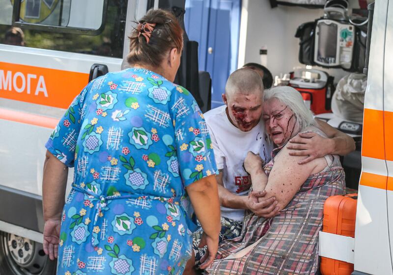 Un hijo intenta consolar a su madre después de que resultó herida durante los bombardeos del ejército ucraniano en el centro de Donetsk. Los ataques dejaron al menos a cinco personas fallecidas y a 15 heridos. | EFE (SERGEI ILNITSKY)