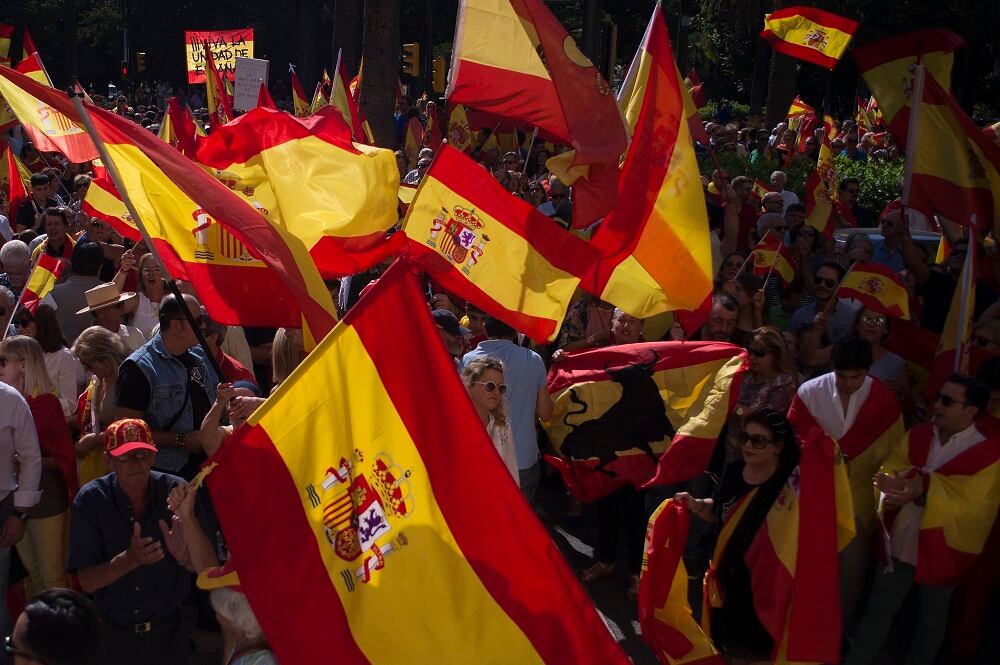 En medio de una marea de banderas nacionales, los manifestantes corearon consignas como "Cataluña es España", "viva España" o incluso "Puigdemont a prisión", en referencia al presidente regional catalán, Carles Puigdemont.
