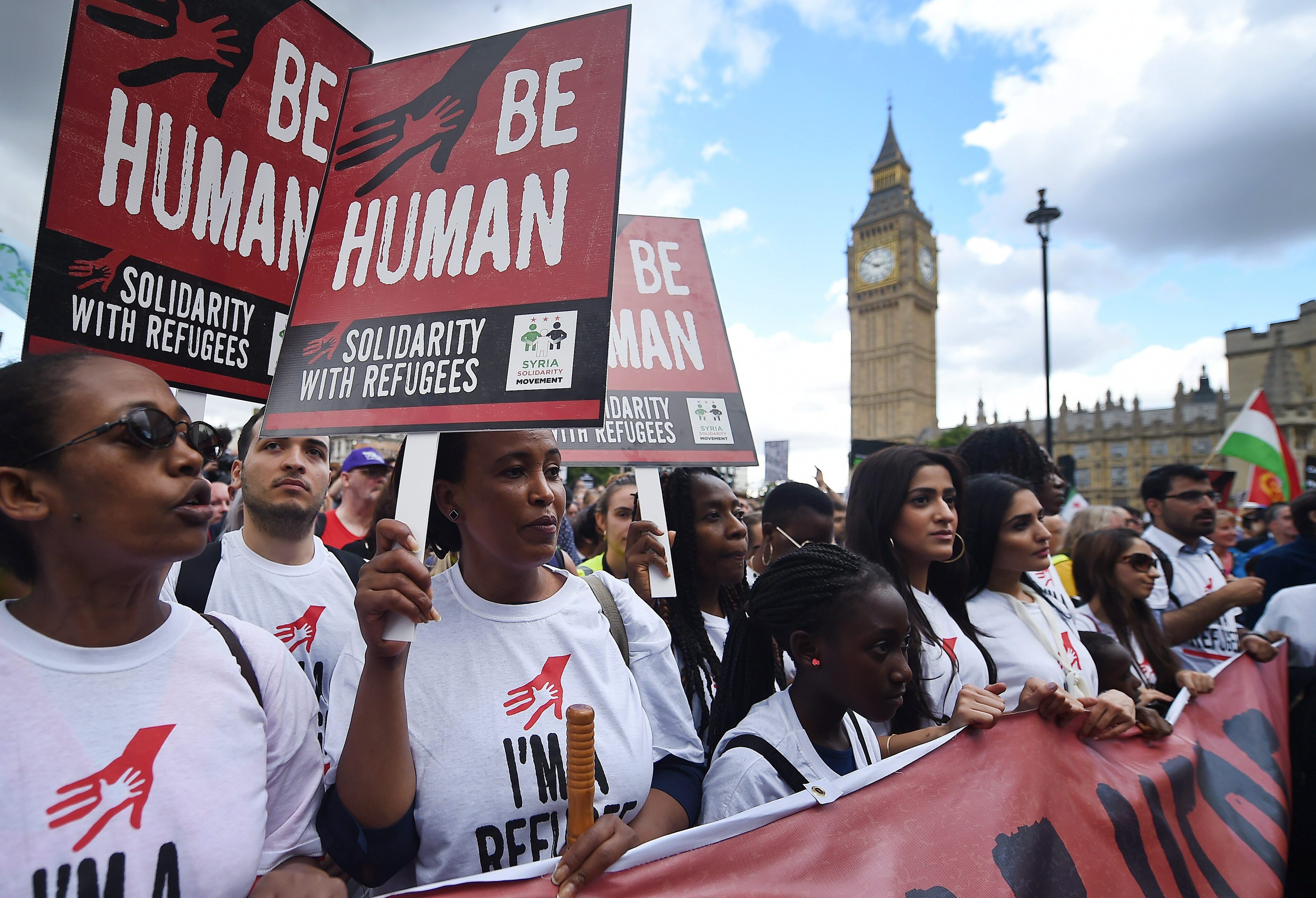 Con lemas como "Abran las fronteras" o "la vida de los refugiados cuenta", decenas de miles de personas reclamaron en Londres al gobierno de David Cameron una política de acogida más generosa para los refugiados que huyen de conflictos en Siria, Irak o Afganistán.
