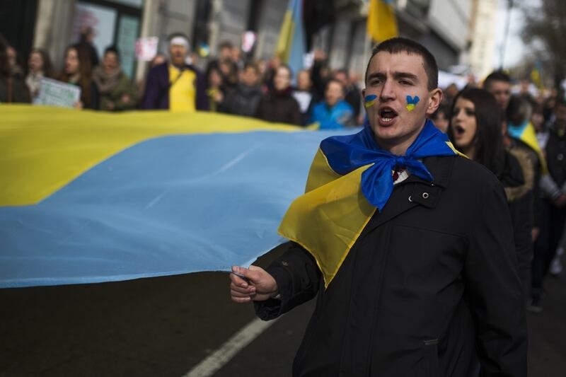 Manifestantes españoles gritan consignas y llevan la bandera ucraniana en una marcha de apoyo en Madrid. | AP (Andres Kudacki)