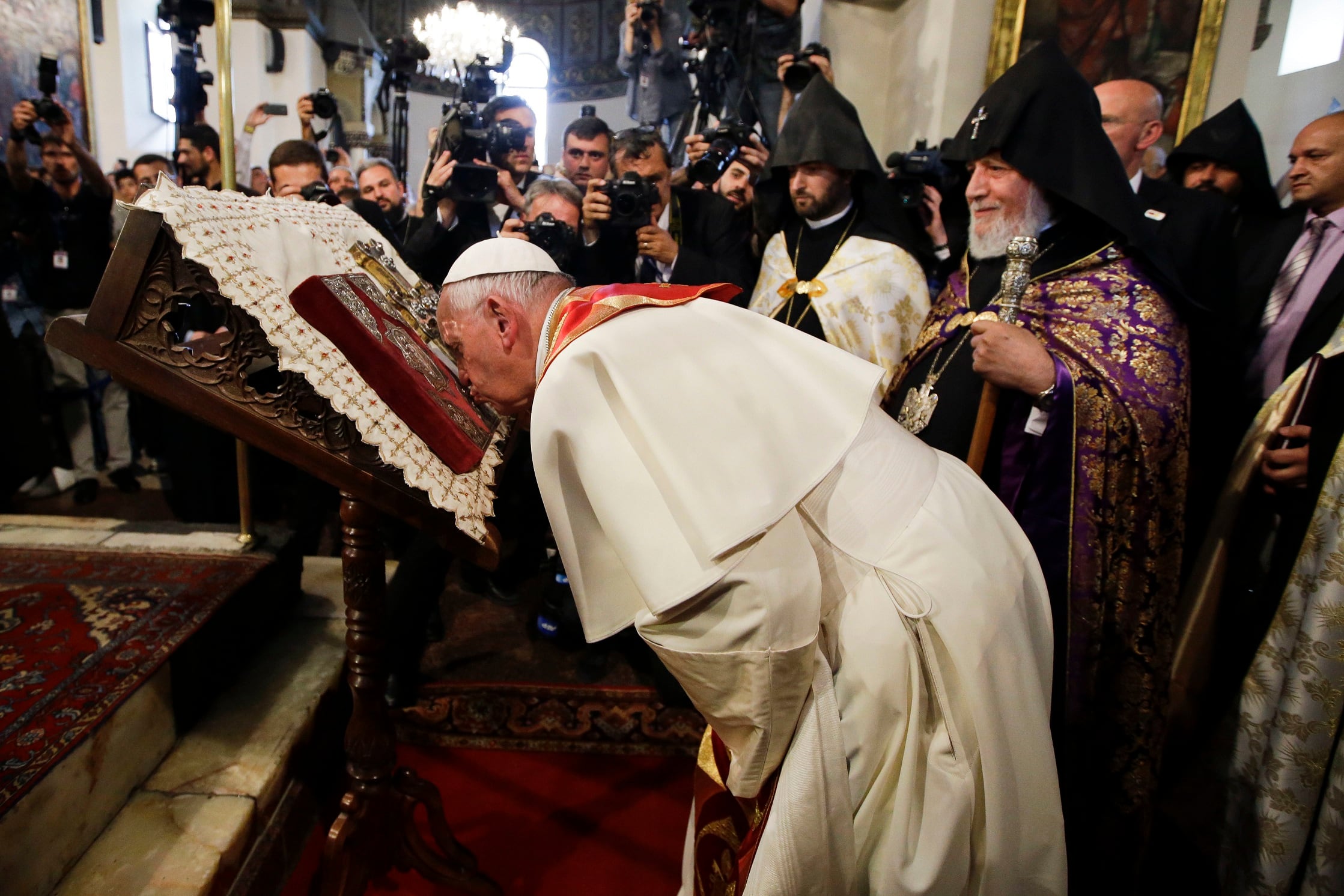 El papa Francisco, flanqueado por el katholicós Karekin II, líder de la Iglesia armenia, besó el viernes una Biblia en la catedral de Etchmiadzin. (AFP)