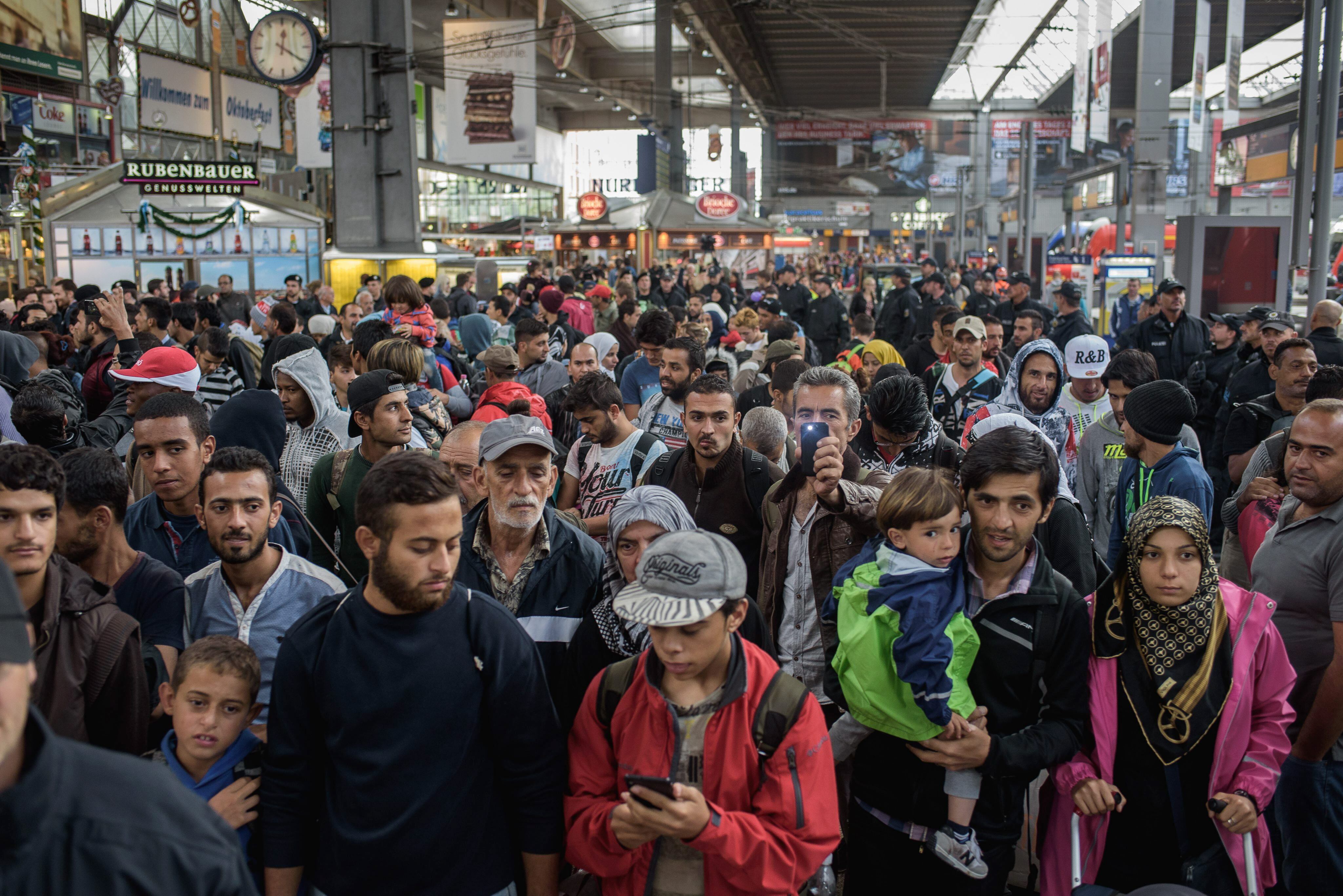 Refugiados de Oriente Medio luego de arribar a una estación de tren en Munich, Alemania. (EFE)
