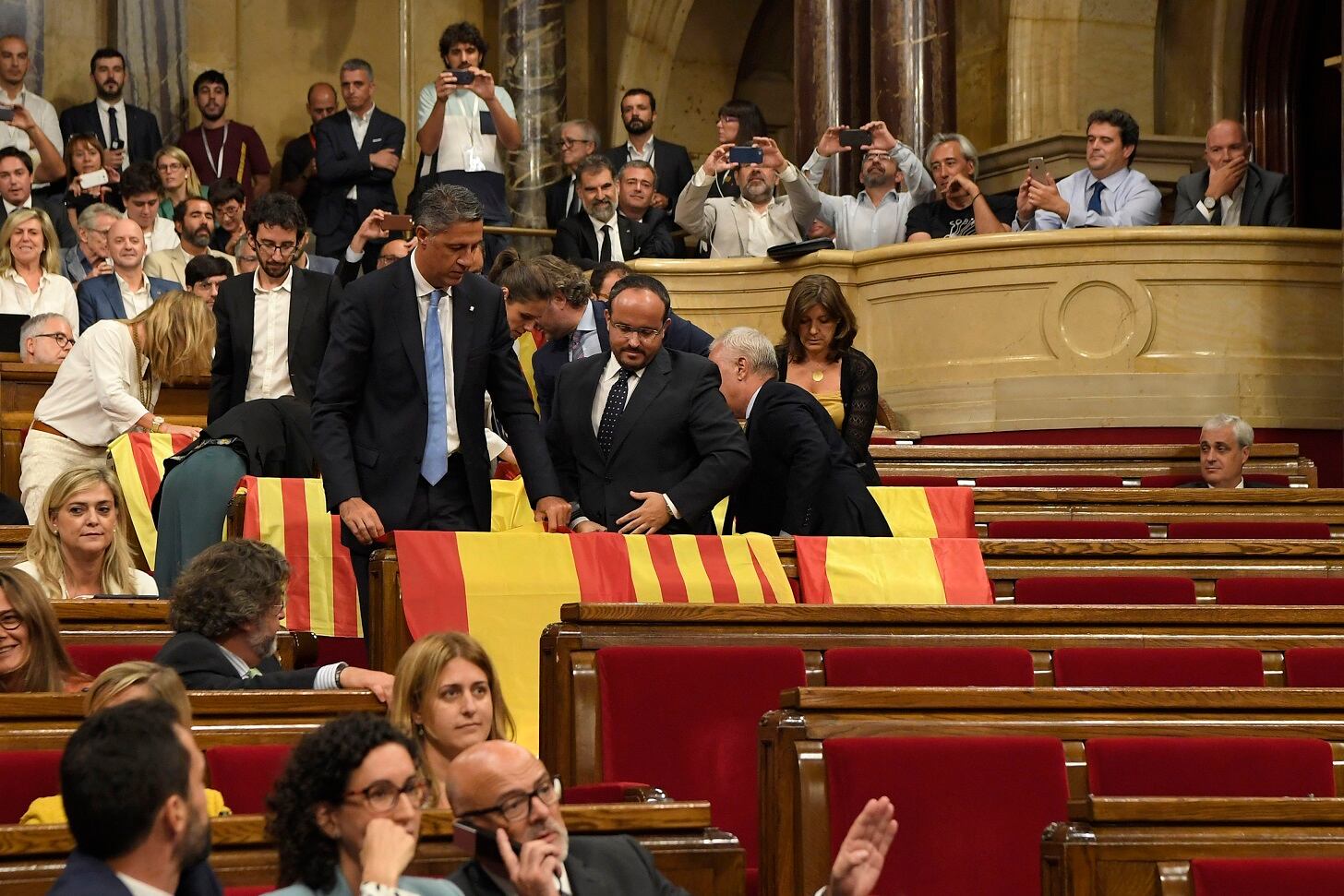 Mientras dejaban el Parlamento catalán, antes de la votación de la ley de referendo, diputados del Partido Popular desplegaron banderas de España el miércoles 7 de setiembre del 2017. (AFP)