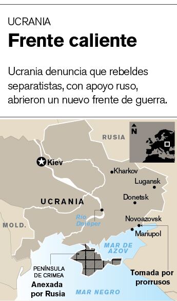 Según las autoridades de Kiev, las fuerzas rusas en su territorio tomaron el control de la ciudad fronteriza estratégica de Novoazovsk, sita a unos 100 km al sur del bastión rebelde de Donetsk.