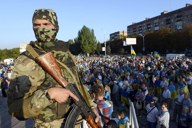 Un militar resguarda una reunión de ucranianos en la plaza de Mariupol. El ejército de Kiev afirmó que repelió un ataque de insurgentes en el aeropuerto del bastión separatista en Donetsk en el este de Ucrania. | AFP (Alexander KHUDOTEPLY)