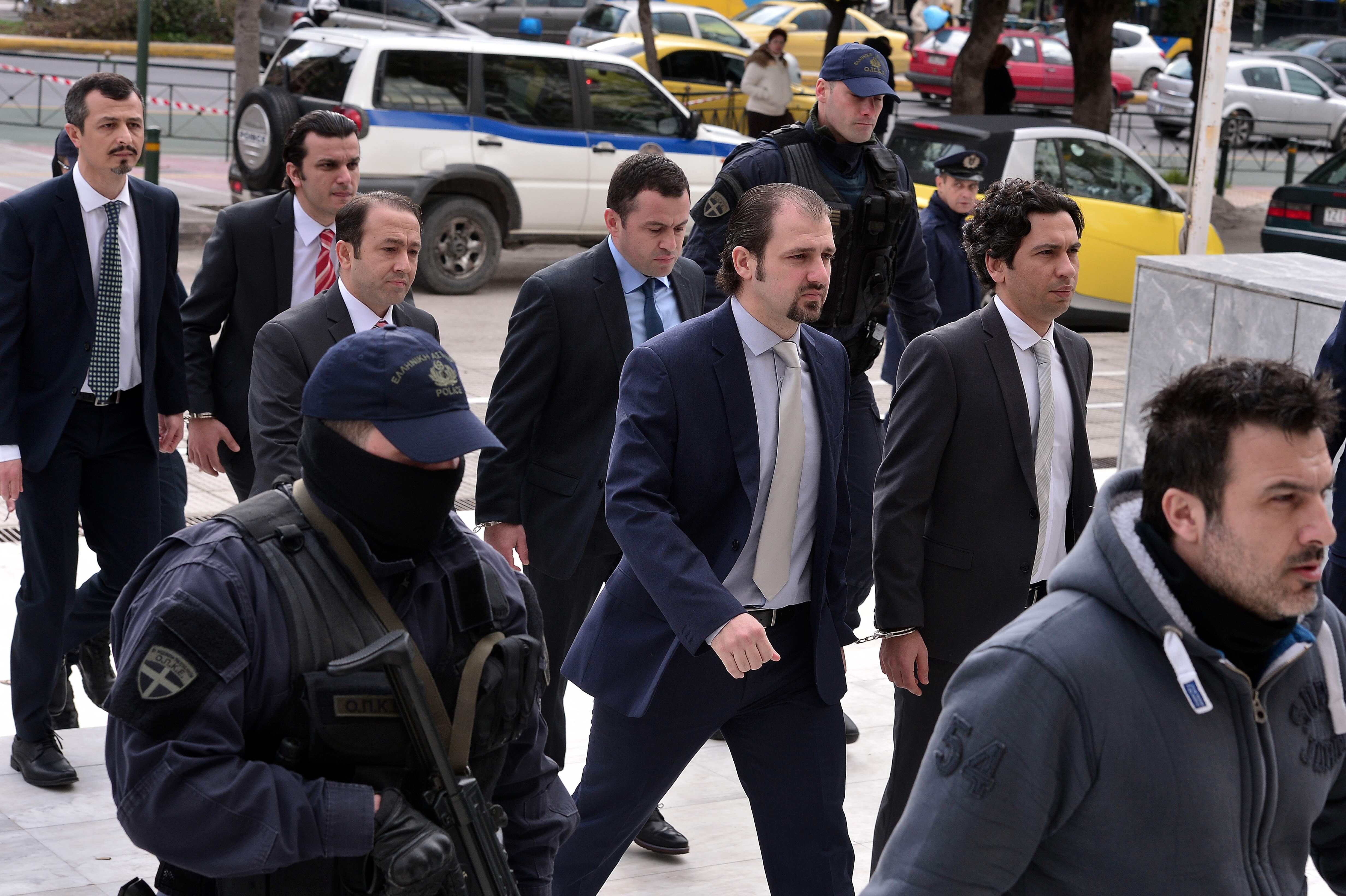 Ocho militares turcos llegan a la Suprema Corte de Grecia escoltados por policías, el jueves 26 de enero. La Corte griega rechazó una solicitud para extraditarlos porque considera que no tendrán garantías para su vida en Turquía. (AFP)