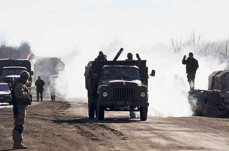 Soldados ucranianos abandonaban el miércoles Debáltsevo a bordo de vehículos militares, en el área de Donetsk, Ucrania. (EFE)