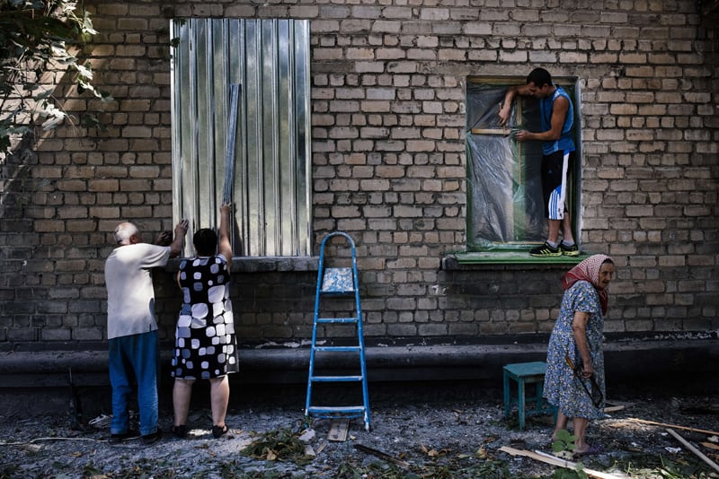 Esta familia cubre las ventanas de su casa que resultaron destruidas como consecuencia de un bombardeo sobre la ciudad de Donetsk, en el este ucraniano, rodeada por tropas del Gobierno de Kiev. | AFP (DIMITAR DILKOFF)