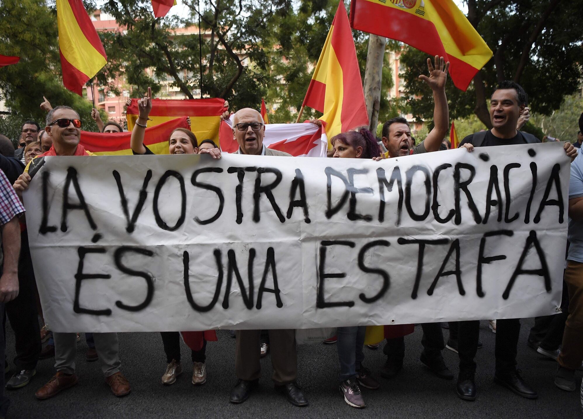 Manifestantes que se oponen a la independencia de Cataluña se manifestaron este viernes 22 de setiembre del 2017 frente a la sede de la Asamblea Nacional Catalana (ANC), en Barcelona. (AFP)