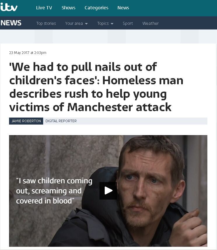 Este indigente, de 33 años, es uno de los identificados como "los héroes del atentado de Mánchester".