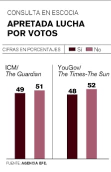 Dos sondeos sobre intención de voto divulgados en las últimas horas muestran una ligera recuperación del campo unionista, después de que una consulta publicada el domingo causó turbulencias en los mercados y entre los partidos británicos al dar por primera vez el triunfo al “sí” .