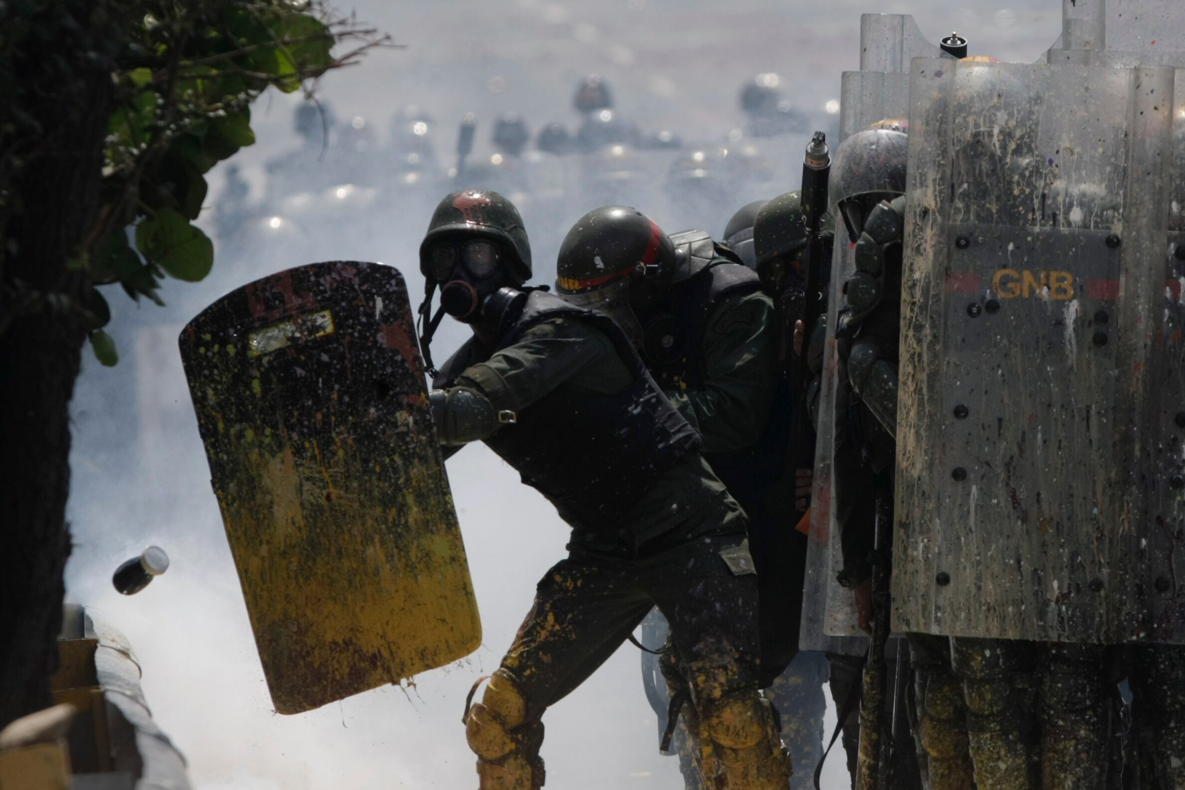 Varios manifestantes fueron impactados por las ráfagas de bombas lacrimógenas que lanzaron militares y policías desde camiones blindados contra la marcha en la principal autopista de Caracas.