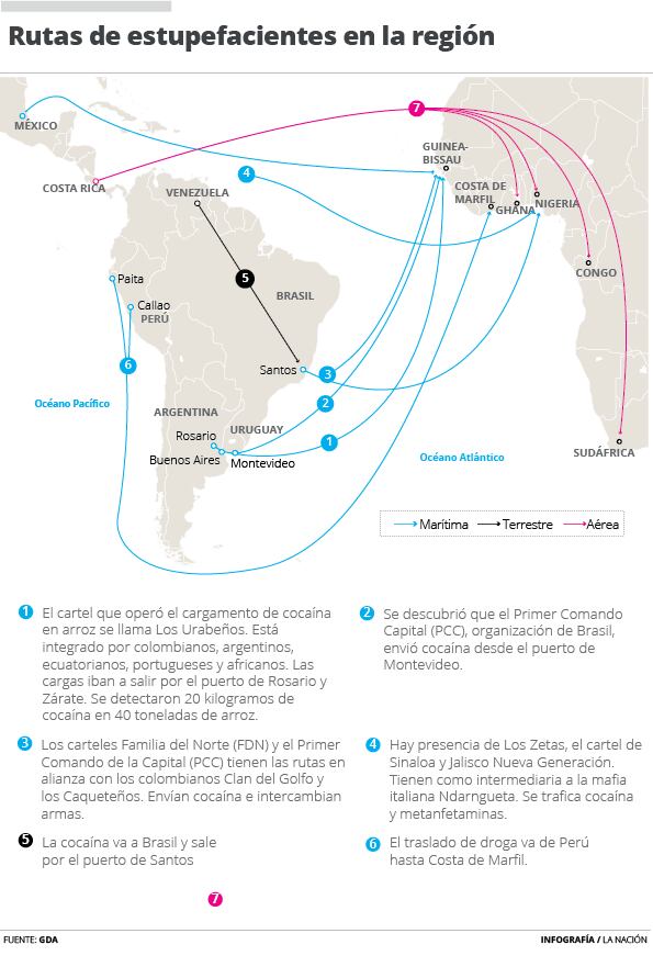 Otros puertos bajo la lupa son el de Montevideo, en Uruguay, y los de Buenos Aires y Rosario, en Argentina. Por ejemplo, la Policía uruguaya detectó que el grupo brasileño Primer Comando de la Capital traficó cocaína desde Montevideo hacia el continente africano.