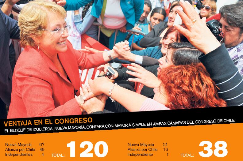 El bloque de izquierda Nueva Mayoría, que postuló a Bachelet, obtuvo 67 escaños de los 120 de la Cámara de Diputados, la derecha, 49 y cuatro son independientes. En el Senado, 21 bancas son para la izquierda, 16 para la derecha y una es independiente.