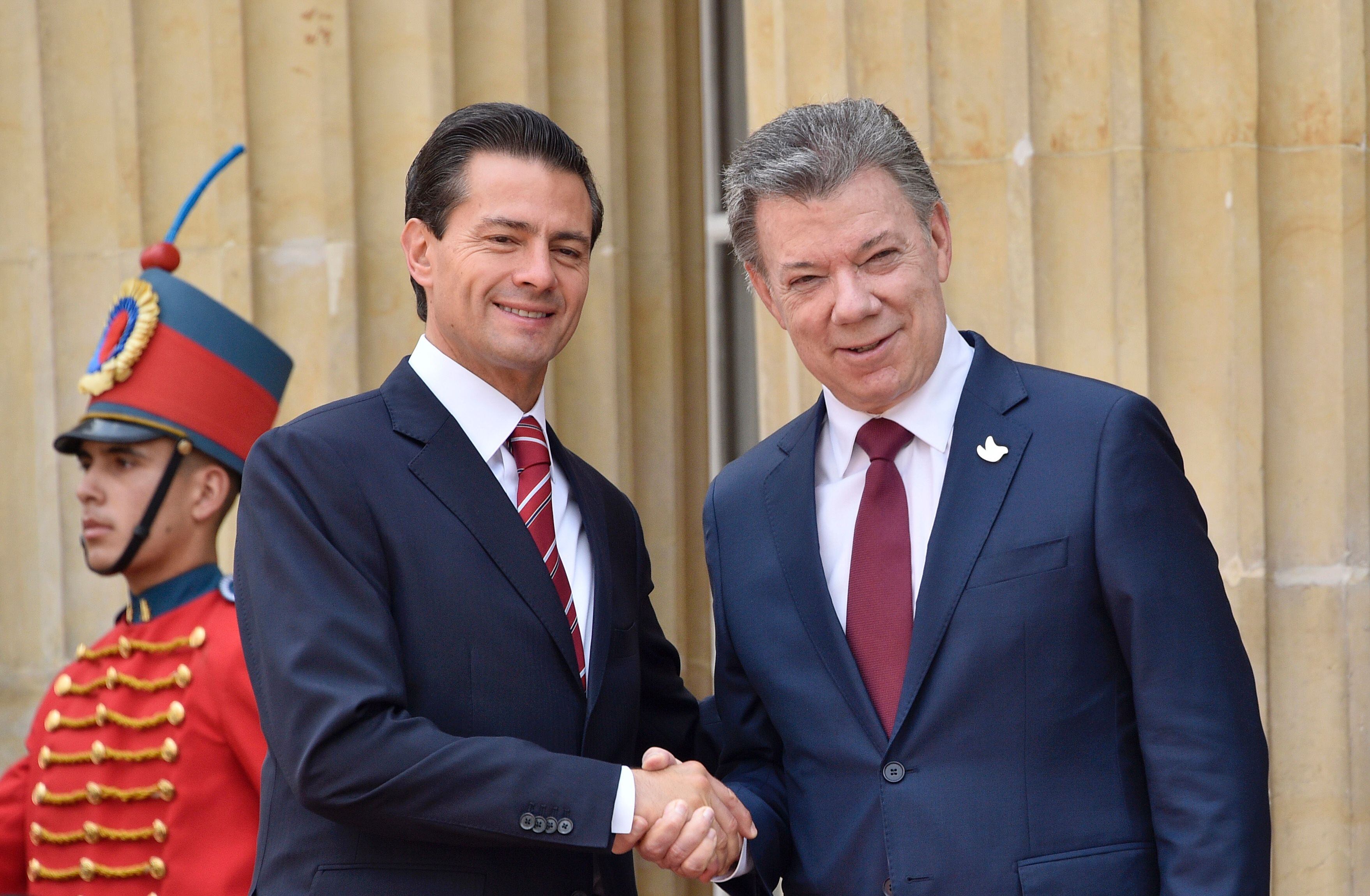 El presidente colombiano, Juan Manuel Santos, anunció la suspensión del diálogo de la paz con la guerrilla ELN mientras compartía con su homólogo mexicano, Enrique Peña Nieto. (AFP)