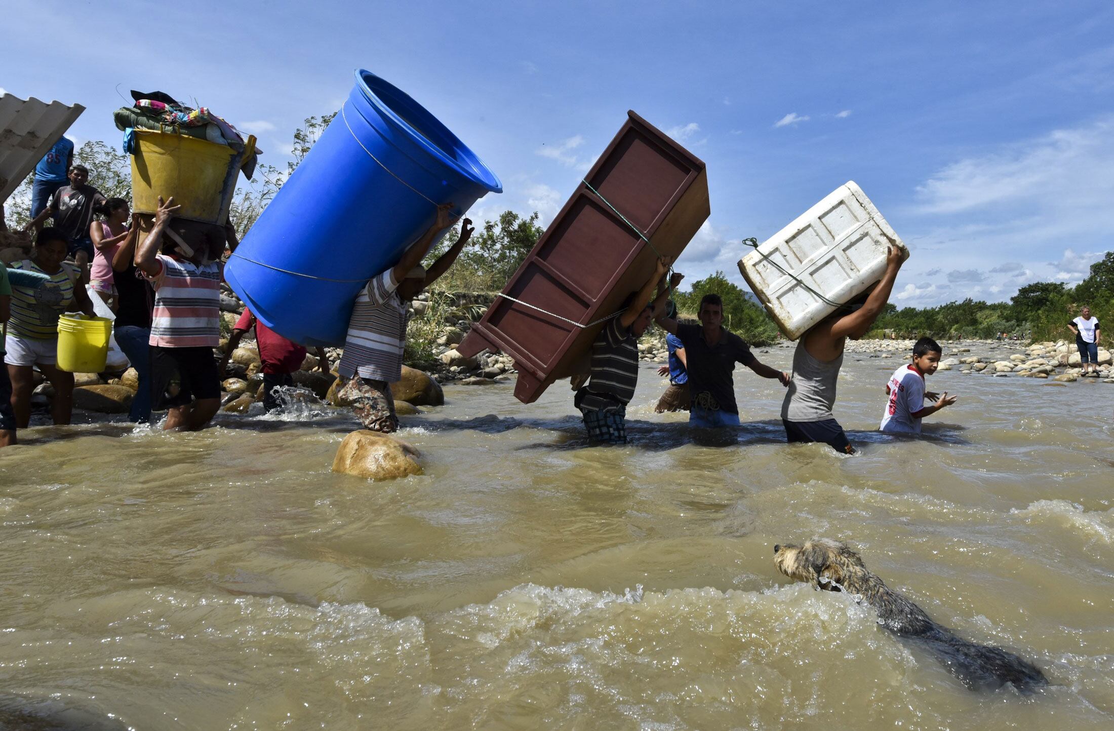 Niños, ancianos y mujeres embarazadas o con bebés en brazos atraviesan el río bajo la aparentemente descuidada mirada de la Guardia Nacional Bolivariana (GNB) de Venezuela que parece haber abierto la mano ante este drama .