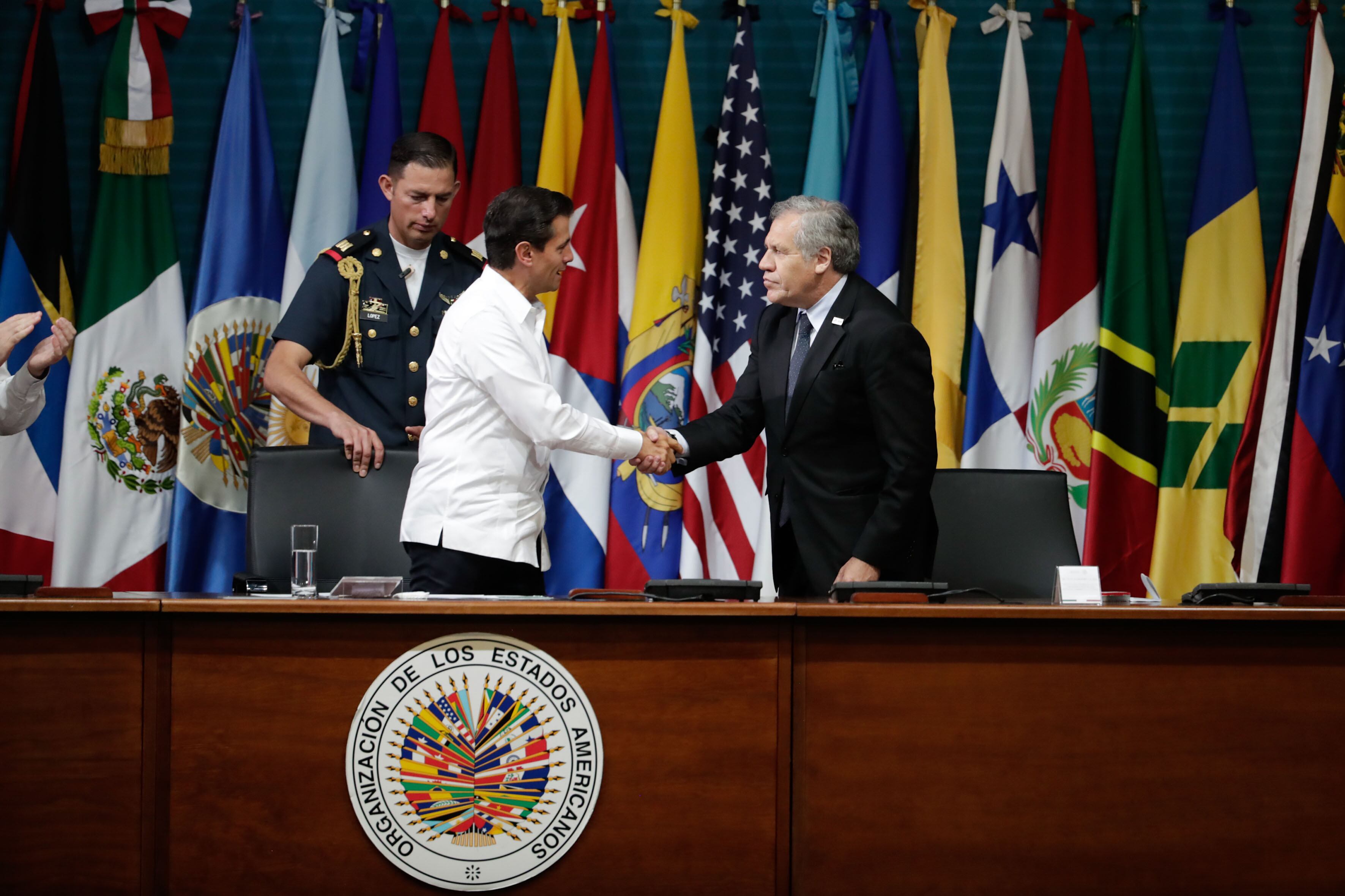 El presidente, Enrique Peña Nieto (izquierda), y el secretario general de la Organización de los Estados Americanos, Luis Almagro Lemes, durante la inauguración de la 47°. Asamblea General de la OEA, en el hotel Moon Palace. (El Universal)